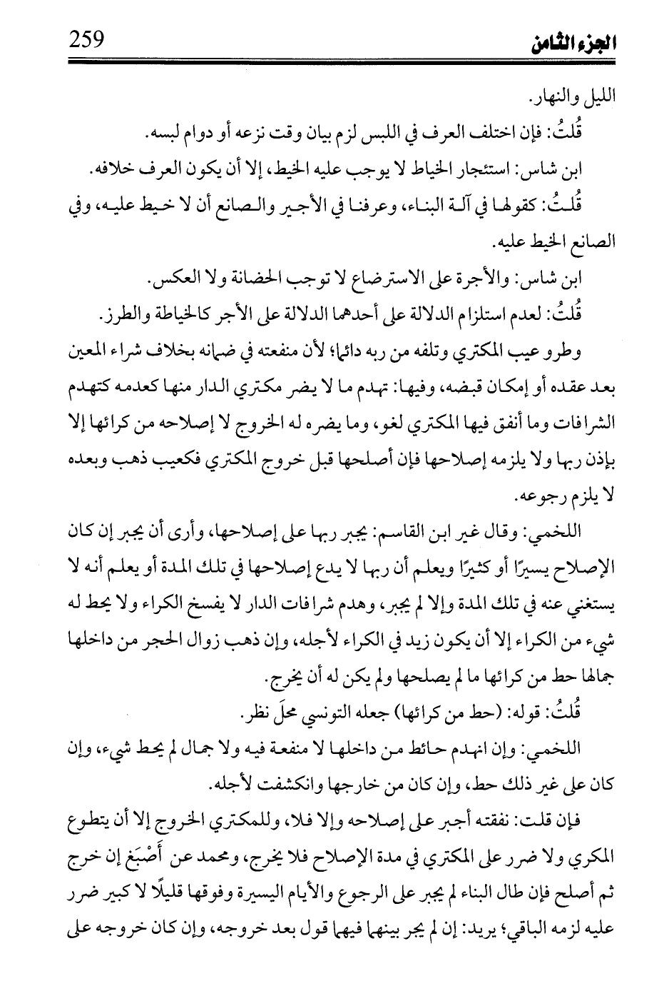 وقال غيره: يلزم رب الدار الإصلاح، فإن سكت لزمه كل الكراء وإن كثر لم يلزمه إصلاح بإجماع فإن عاب السكنى ونقص من الكراء ولم يبطل من المنفعة شيئًا ككون الدار مبلطة مجصصة فيذهب بتبليطها وتجصيصها خير المكترى في سكناه بكل الكراء وخروجه ما لم يصلح الدار بها، فإن سكن ساكتًا لزمه كل الكراء على قول ابن القاسم فيها خلاف سماعة عيسى وقيل: حكم هذا الوجه كالبيت ينعدم من دار ذات بيوت وهو بعيد فإن أبطل اليسير من منافع الدار كالبيت ينهدم من دار ذات بيوت لزمه السكنى وحط عنه مناب المنهدم ومناب المنهدم من الكراء، وإن أبطل أكثر منافعها ومنفعة البيت الذي هو وجهها وهو بعيد، وإن أبطل اليسير من صانع الدار كالبيت الذي هو وجهها أو يكشفها بانهدام حائطها وما أشبه ذلك خير المكتري في سكناه بجميع الكراء وخروجه، فإن أراد سكنى ما بقي بمنابة من الكراء لم يكن له ذلك إلا برضي رب الدار، فإن رضيا جرى على جمع الرجلين سلعتين في البيع، وإن بني المكتري الدار قبل خروجه لزمه الكراء ولا خروج له، وإن بناها بعد خروجه لم يلزمه الرجوع، وإن سكنها مهدومة ساكتا فعلى قولي ابن القاسم فيها وفي سماع عيسي.