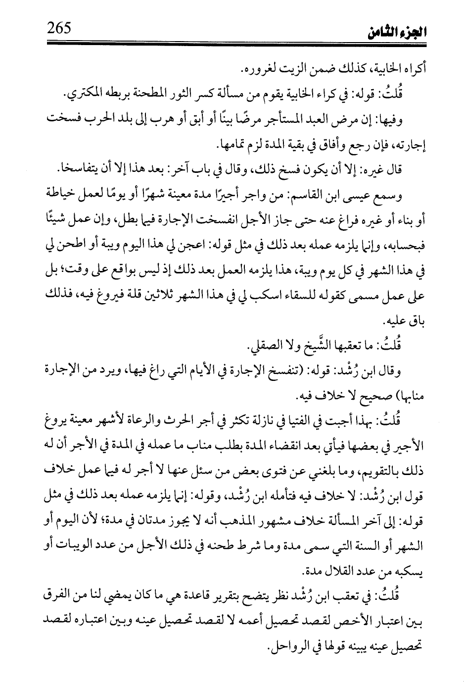 فى أحكام ابن سهل: عقد ابن دحون قبالة رحى على نهر قرطبة لمدة عينها على أن تطوع المتقبل ينقد الكراء آخر العقد، وعلم أن الرحا يتعذر طحنها فى الشتاء، وإنما يستقيم بالصيف فأرد استغلالها بالشتاء، وطلبه عند صاحب السوق أبى على بن ذكوان فشاور فى ذلك فأفتى القرشى بأن القبالة لاتجوز؛ لأ ن الرحة غير مأمونة، وأفتى ابن حرج بصحتها وأنها مأمونة وله استغلالها فى الشتاء، وقال ابن عتاب: ذكر طوعه بالكراء فى آخر العقد يوجب كونه فيه فخرج عن كونه طوعًا إلى كونه شرطًا فى العقد، فإن أثبت القائم أنها غير مأمونة فسخت.