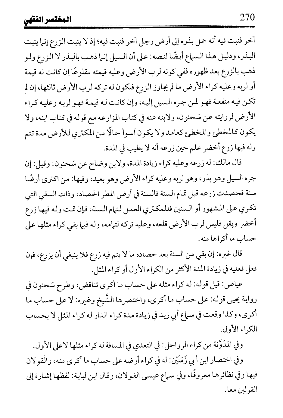 ابن رشد: وأن لم يكن ينتفع ب فلربها أخذه مجانا، وإن ادعى حرثها بعلمه لا باكتراء فإن حلف ربها ما علم بحرثه فكما مر، وإن نكل يحلف الحارث وبقى له زرعه ولزمه كراء المثل، وإن ادعى حرثها باكتراء منه فإن حلف ربها على نفيه فكما مر فإن نكل حلف الحارث، ولو كان ما أقر به من الكراء أكثر من كراء المثل ليثبت بحلفه بقاء زرعه، وفى حلفه مطلقا أو ما لم يدع ما لا يشبه قولان للمشهور، وقولها فيحلف قال: وقعت المال بضاعة ونكل حلف مدعى قبضه قراضا إن كان مثله يقارض.