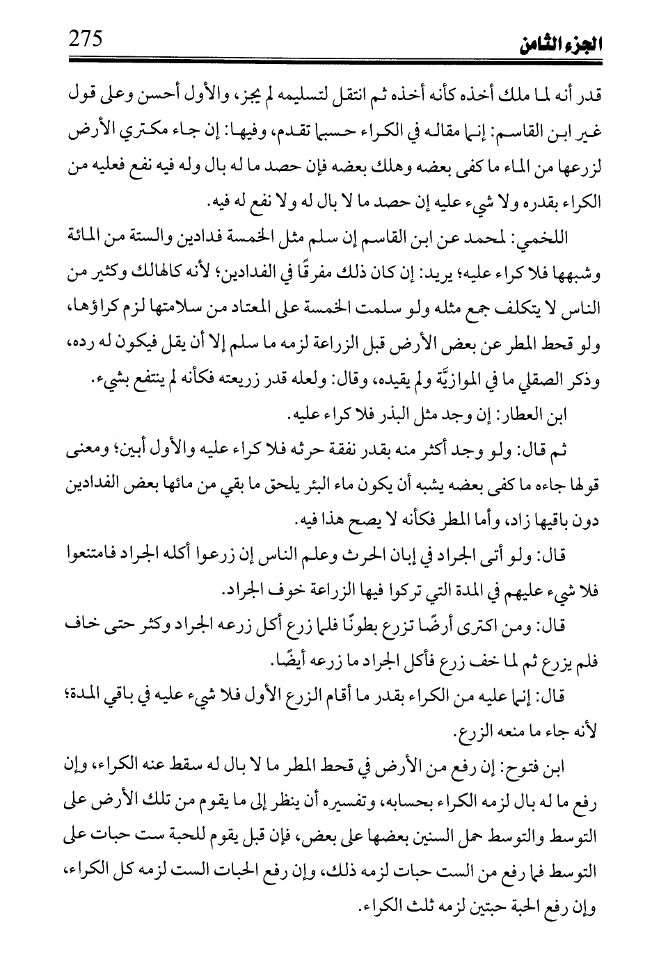 قال: وأرى أن يوكل لأمانته ويعلم أنه متى اختار أخذها بالقيمة لم يجز أن يدفع عن ذلك منافع ويجوز على قول أشهب، وعلى القول بفساده يفسخ البيع فى المبيع إن كان معينا ما لم يتغير فيمضى بالقيمة يوم العقد الثانى؛ لأنه مقبوض فى أرضه، ولو قال: على أن له نصفه من الآخر شائعا ولا قسم حتى تنقضى الإجارة فتغير لذلك لم يكن فوتا؛ لأنه غير ممكن منه، وقيل هو فوت والنصف الآخر باق على ملك ربه، وفيها لو تمت المدة وفى الأرض لمكتريها زرع لم يبد صلاحه لم تجز لرب الأرض شراؤه.
