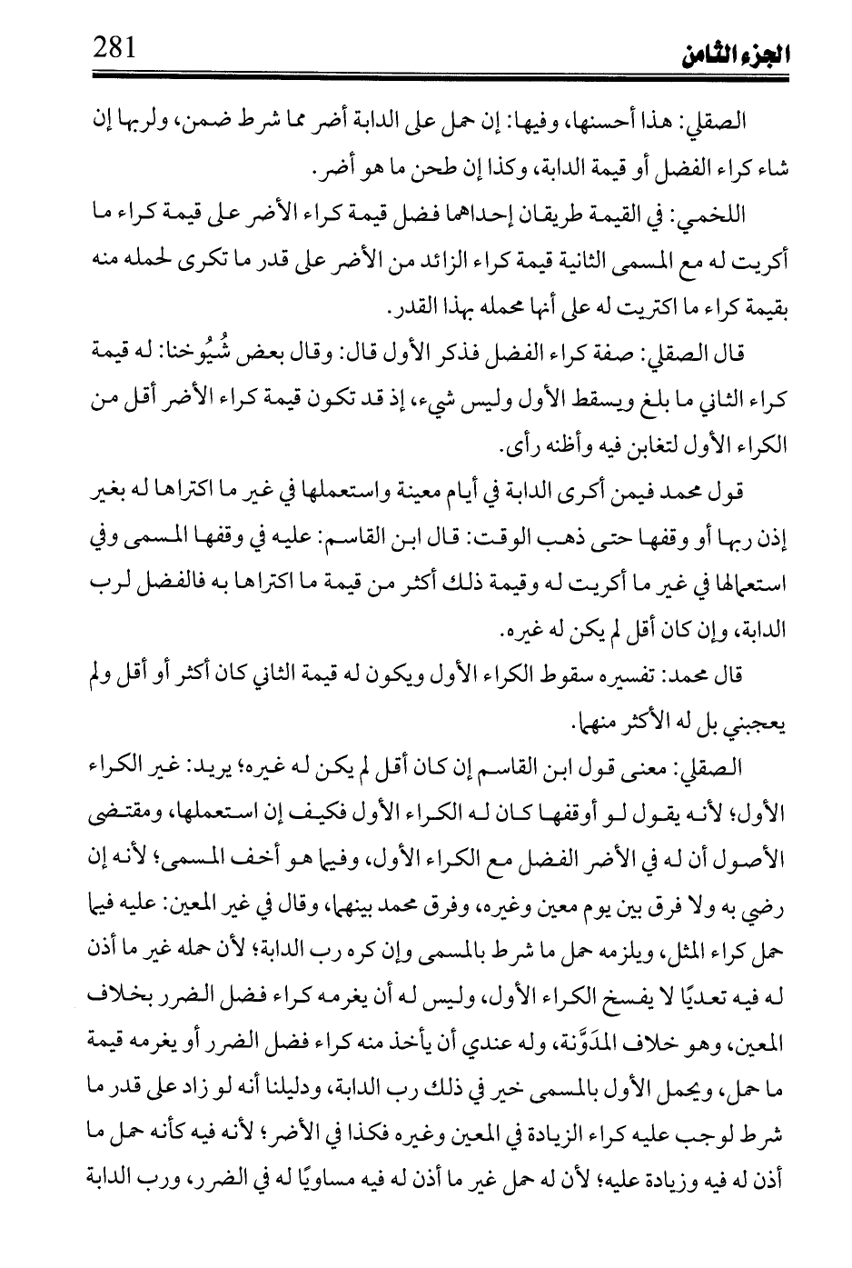 فيها من اكترى أرضًا ثلاث سنين فزرعها سنة، ثم تهور بئرها أو انقطعت عينها قوم العام الأول على قدر نفاقه وليس كراء الأرض فى الصيف والشتاء واحدًا وكذا بحسب كراء الدور في الهدم لا على عدد الشهور، وقد تكرى السنة لأشهر منها كدور مصر أو بمكة لكثرة عمارتها فى الموسم.