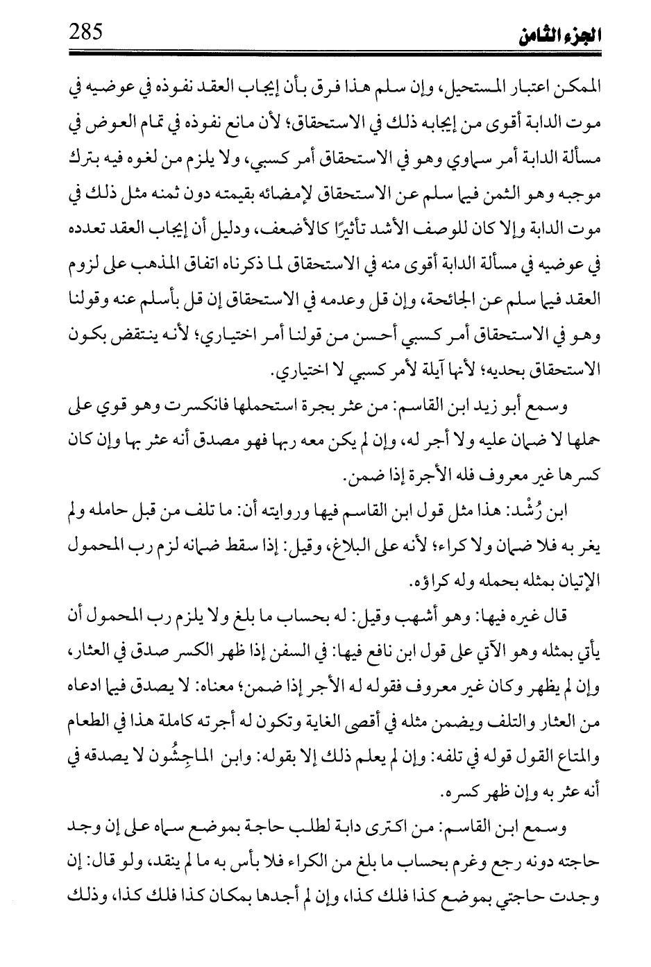 قال ابن رشد: ولو شرط في كراء الدابة إلى موضع معين أنه إن لم يجد حاجته تقدم بها إلى موضع آخر ففي جوازه لشرط قيمته الموضع الذي يتقدم إليه أو كونه معروفًا، إن لم يكن بحساب الكراء الأول ولا تبعًا له أو بشرط كونه بحسابه، ثالثها: مع كونه تبعا لابن القاسم على أصله في لغو اعتبار الأطماع سماع أشهب مع سماع عيسى: لاعتبار الأطماع مع اختلاف الكراء ولغوه مع اتفاقه، وابن الماجشون: لإتباع الأطماع مطلقًا.
