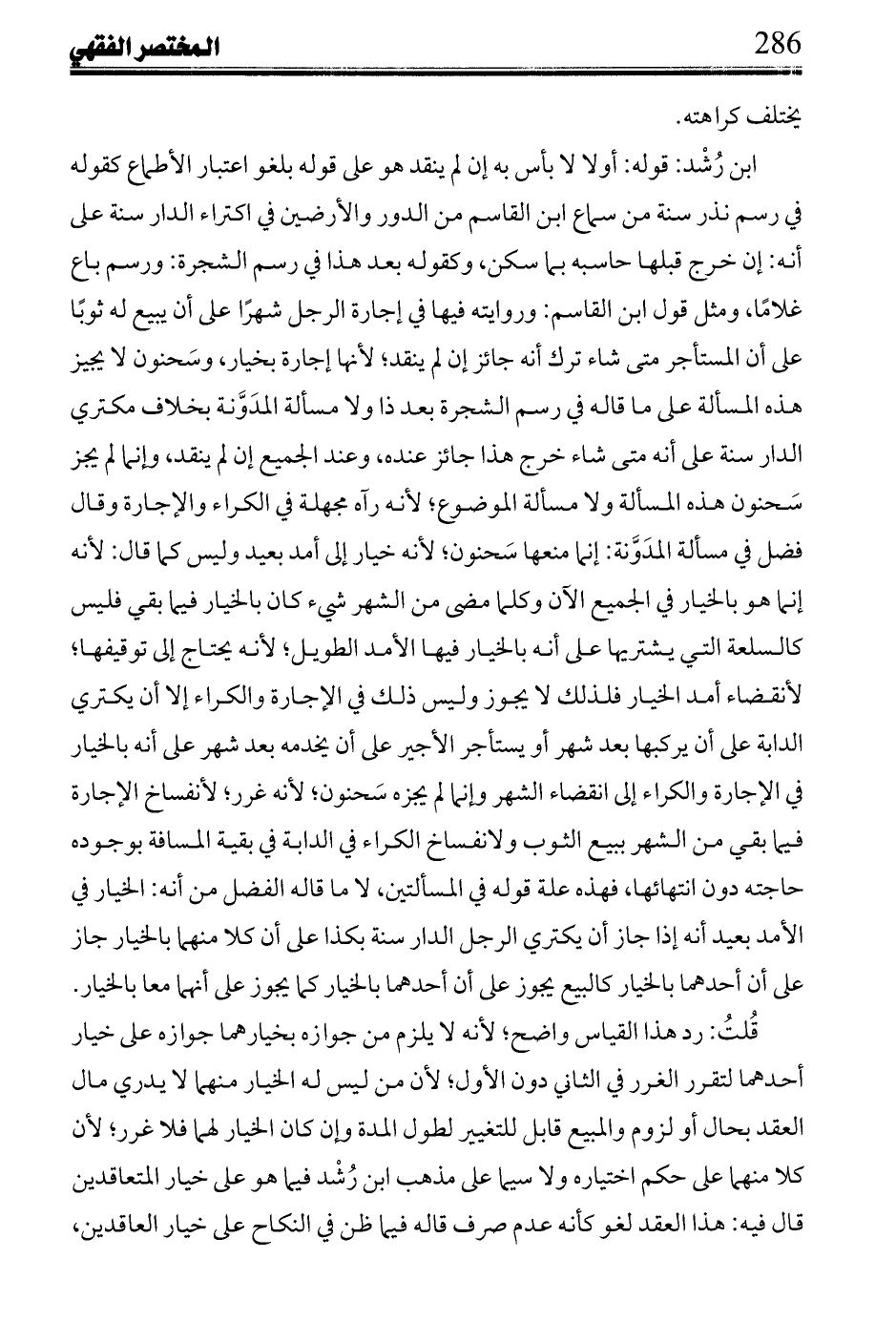 الرحى بكثرة الماء، أو نقصه يوضع عنه قدر مدة الخلاء، وكذا الفنادق تكترى لأيام الموسم إن أخطأها ذلك لفتنة أو غيرها، ولو كان المكتري مقيمًا آمنا بخلاف الدور تكترى، ثم تخلو الفتنة والمكتري مقيم آمن أو رحل لوحشه، وهو آمن فإنه يلزمه الكراء، ولو رحل لخوف سقط عنه مدة الخلاء في نوازل ابن رشد: إن قل الواردون من البلاد سكنى الفنادق المكتراة للنزول بها من فتنة أو خوف طرق وشبه ذلك، أو قل الواردون للطحن بالأرحاء المكتراة لجهد أصاب أهل ذلك المكان فهو عيب يخير لأجله المكترى في تماسكه أو فسخ الكراء عنه، فإن سكت ولم يقم حتى مضت المدة أو بعضها لزمه جميع الكراء، ولا يسقط عنه الكراء إلا بخلاء أهل ذلك الموضع حتى تبقى الرحى معطلة لا تطحن، والفنادق خالية لا تسكن ولا يلزم المكري إن قل الواردون أن يحط للمكتري من كرائه بقدر نقص الواردين بغير رضاه، وقول ابن الحاجب وابن شاس: لا تنفسخ الإجارة بإقرار المكري بغصب المكري واضح كقولها في لغو إقرار الراهن بجناية العبد الرهن بعد رهنه لا يقبل على المرتهن، ويخير المقر له بغضب العبد المكري في إمضاء الكراء فيستحق ما أكرى به، وفي تضمينه قيمة العبد إن طالت مدة إجارته لا مطلقًا خلافًا لبعضهم.