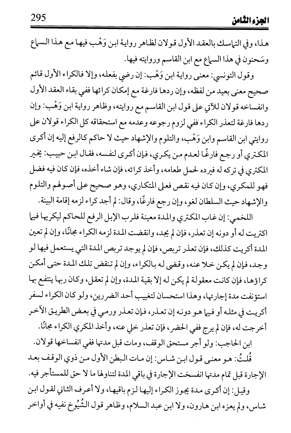 قُلتُ: فظاهر أقوالهم عدم خلاف في نقضه بالموت، وقد يتخرج عدم فسخه من فتوى أهل طيطلة في نسألة الشقص يكريه مشتريه، ثم يقوم الشفيع قبا انقضاء المدة حسبما يأتي في بلوغ اليتيم قبل تمام مدة إجازته قلا: وقباله أحباس المساجد والمساكين غير المعينين جائزة لمدة طويلة، واستحسن قضاة قرطبة أربعة أعوام خزف دروسها بطول مكثها بيد متقبلها، ورأى أهل البصر أن هذه المدة أقصى ما يبقى الزبل في الأرض؛ لأن المتقبل يزبل ويعمر واستحسن قوم من أهل الاحتياط أن لا تقبل ممن يجاورها خوف أن يخيف منها، ولا من ذوي قدرة بغير ما وجد ابن عات إنما المدة أربعة أعوام في الأرض والدور والحوانيت وشبهها عدم فقط.