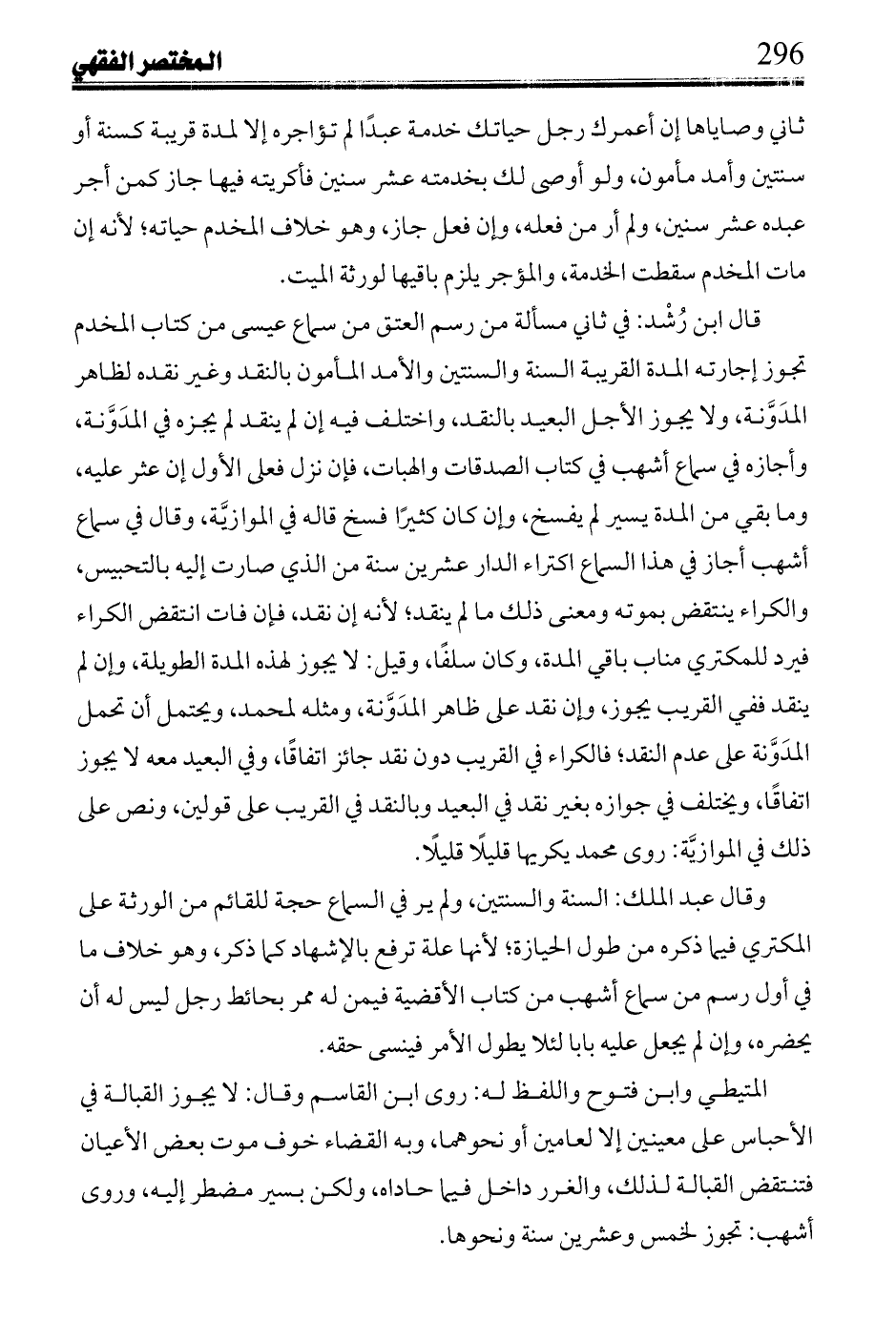 قُلتُ: قول الغير وفاق لتعليله بالعرف، وفي عتقها الثاني من واجر عبده سنة أو أخدمه، ثم أعتقه قبل السنة لم يعتق حتى تتم، ولو مات قبل السنة لم تنتقض الإجازة، ولا الخدمة ويعتق العتق لتمام السنة من رأس ماله إلا أن يترك المستأجر أو المخدوم بقية الخدمة في رسم إن خرجت الثاني من سماع عيسى من الجنايات من أعتق عبده بعد أن أجره سنة قبل سنة قبل تمامها كراؤه لسيده، وإن لم يستثن ماله، وإن كانت أمه لم يطأها أصْبَغ لا شيء لسيده من أجرته إلا لما مضى قبل عتقه قبضه أم لا.