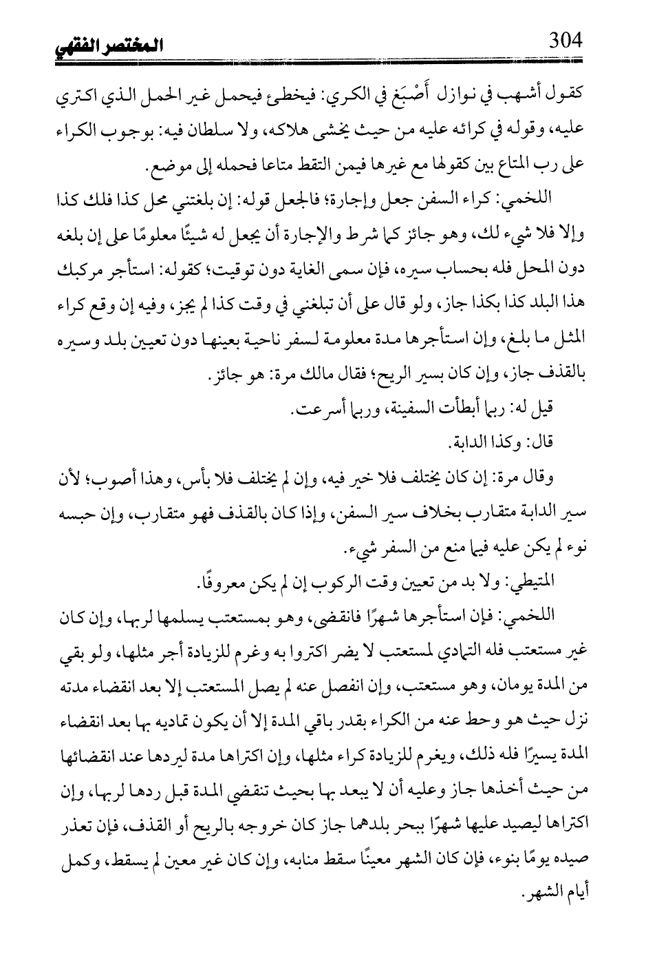 ولأبي زيد عن ابن القاسم: إن ابتل بعض الطعام أو المتاع قوم سليماً ومبلولاً، وسقط من الكراء مناب البلل قل أو كثر، وقال ابن أخي هشام: إن كان ذلك من أمواج عليا أو من خلل في المركب لم يغرر به ربه من سوء عمل أو قلفطة، فإن صار المتاع لا قيمة له سقط كل كرائه، وإلا فمناب العيب فقط، وإن كان من تغرير رب المركب، وسوء عمله، وقلفطفته ضمنه، وماله من رش خفيف، ونداوة ليست بفساد فلا نقص له من الكراء.