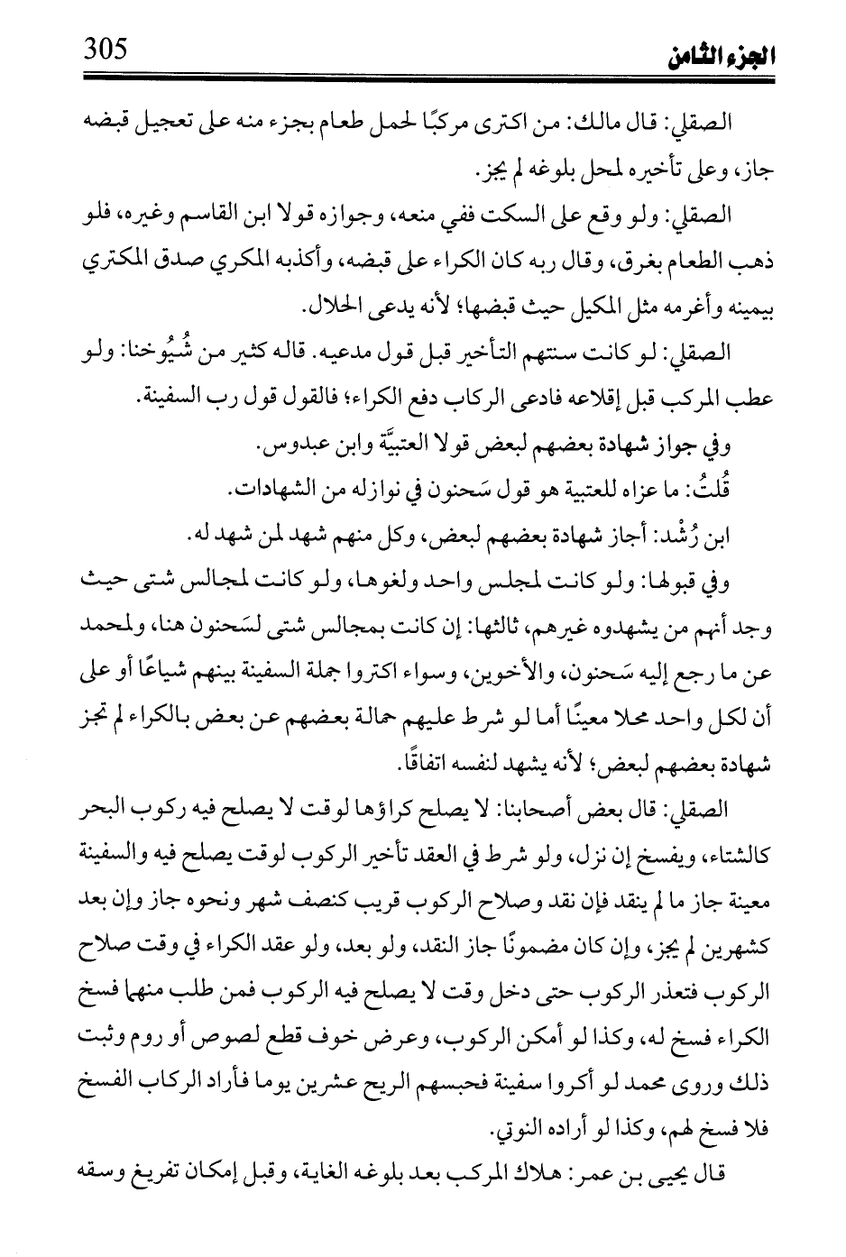 القرافي وقال أبو حنيفة والشافعي: لا يضمن أحد من أهل السفينة إلا من طرح مال غيره، ومن طرح مال نفسه فهو منه، ولو استدعى منه ذلك غيره، ووافقونا فيمن قال: اقض عني ديني فقضاه، فقضاه، وفي رجوع الزوجة على زوجها بنفقتها في غيبته على ولده، والرد عليهم بالقياس على هذه الصورة لجامع السعي في القيام على الغير بواجب؛ لأنهم أجمعين يجب عليهم حفاظ نفوسهم وأموالهم.