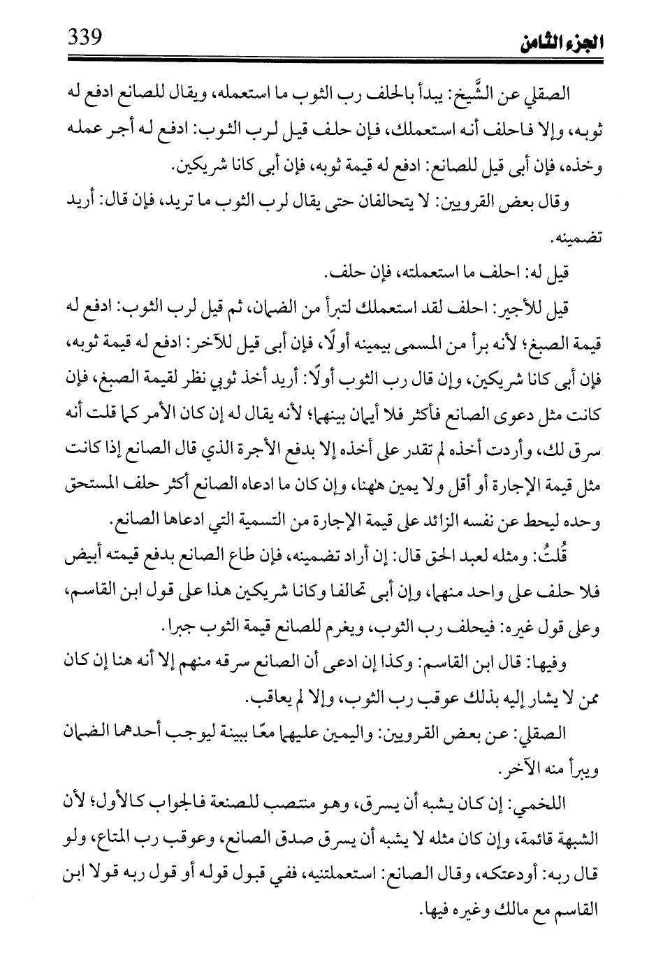 الصقلي عن ابن حبيب: إن ادعى الصانع ما لا يشبه صدق رب الثوب مع يمينه، وخير في أخذه مصبوغًا، ويدفع أجرته أو يسلمه، ويأخذ قيمة ثوبه أبيض.