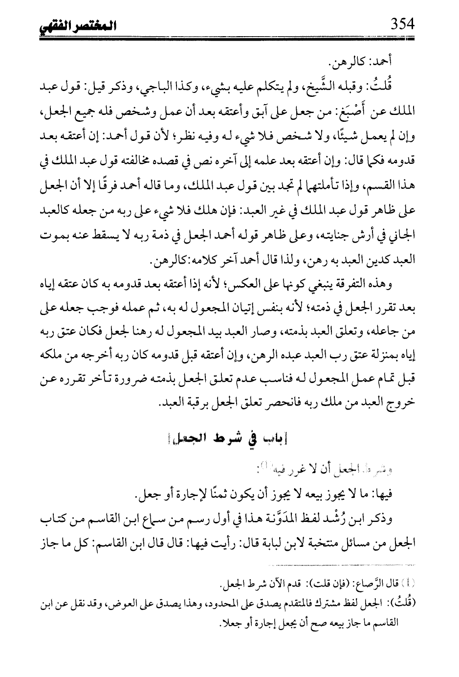 قُلتُ: ما عزاه للمحققين هوما تقدم لعبد الحق، وهو خلاف ما تقدم لابن رشد، ودليل ابن رشد قوله في المدونة: لا جعل له، ولا إجارة فعطفه الإجارة على الجعل ظاهر في عدم إرادته بالإجارة الجعل.