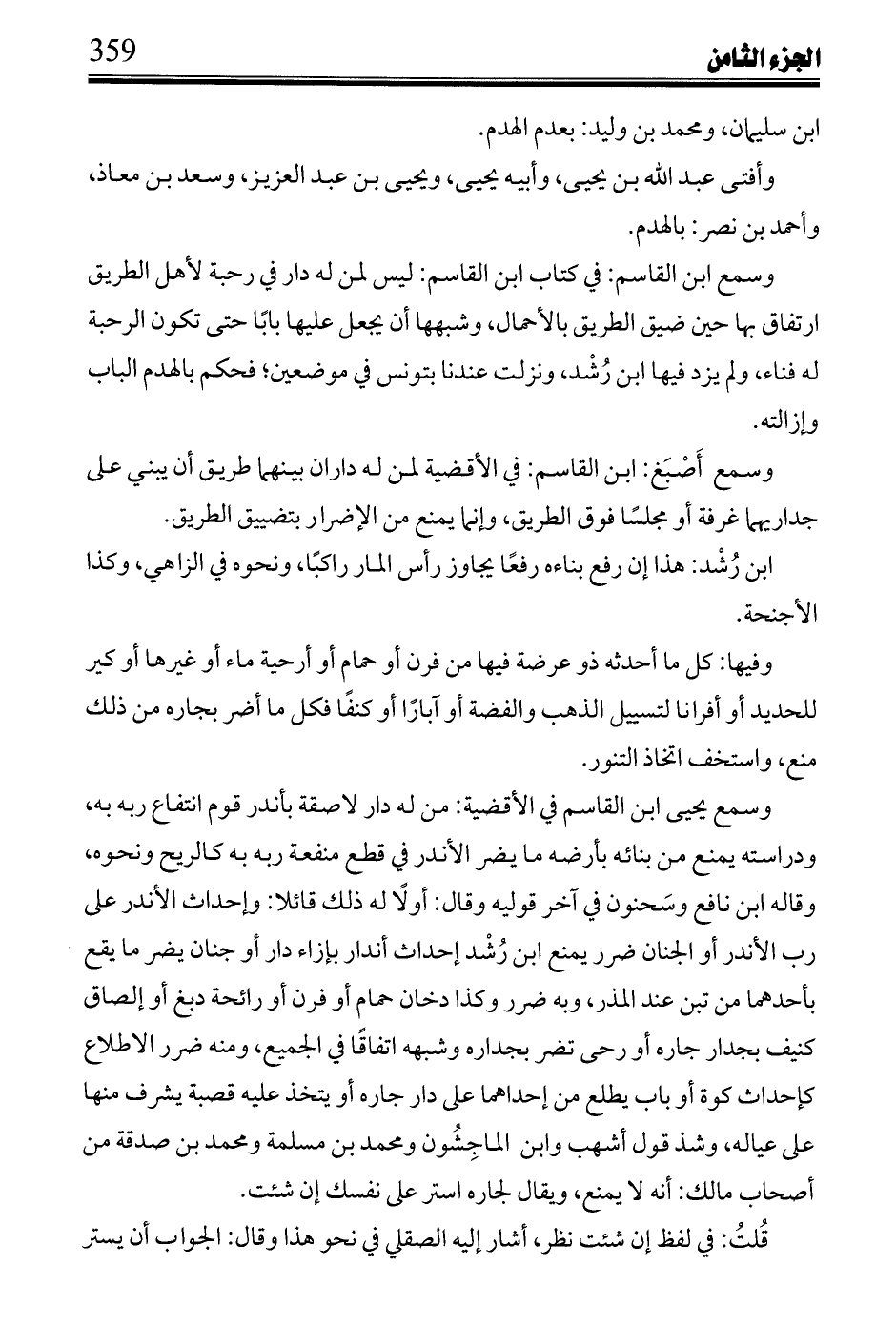 وأفتى الشيوخ عندنا فيمن فتح في قصبته بابًا لا يطلع منه على دار جاره إلا بأن يخرج رأسه من الباب ليطلع أو يخرج إلى السقف أو إخراج أحد منه رأسه ليطلع، وهو أحسن من الفتوى، وإن ثبت ضرر الاطلاع ففي وجوب الحكم بسده، وإزالة أثره خوف دعوى قدمه وعدم وجوب سده، والاكتفاء بجعل أمام ذلك ما يستره قولان لسماع أشهب من الأقضية، وابن الماجشون في الواضحة.