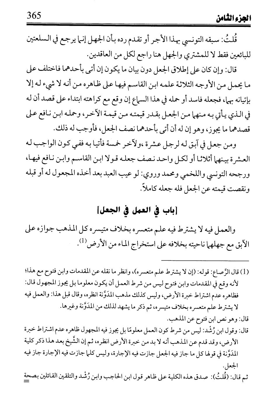 ابن عبد السلام: كلامه يوهم العموم في كل أنواع عمل الجعالة، وليس كذلك مذهب المدونة، ولا يجوز الجعل في حفر البئر لا بعد خبرتها الأرض معًا، وشرط في العتبية استواء حال الجاعل والمجعول له في العلم بحال الأرض.