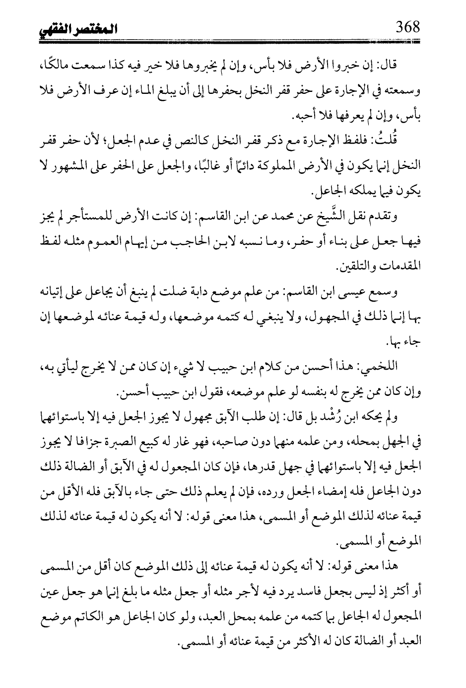 قلتُ: صدق هذه الكلية على ظاهر ابن الحاجب وابن رُشْد والتقين القائلين بصحة الجعل في العمل المجهول لا يصح، وعلى منعه فيه صدقها واضح ويلزم منه منع الجعل على حفر الأرض لاستخراج ماء ونحوه مع جهل حال الأرض لتقدم نصها بمنع الإجارة على حفرها لذلك مع جهل حالها، فلو جاز الجعل فيه مع الجهل كذبت الكلية لصدق نقيضها أو منافيها، وهو قولنا: بعض ما يجوز فيه الجعل ليس بجائز فيه الإجارة أو غير جائز فيه الإجارة الأول سلب، والثاني عدول وذلك البعض هو الأرض المجهول حالها لهما، ولما شاع زمن قراءتنا صحة قول ابن التلمساني في شرح المعلم الفقهية مهما صدقت القضية صدق عكسها إن كان لها عكس، وعكس نقيضها كان يمشي لنا قراءة، وإقراء اعتبار ذلك في كليات الكتاب فعكس القضية هذه بالمستوى واضح صدقه، وهو قولنا: بعض ما يجوز فيه الجعل،