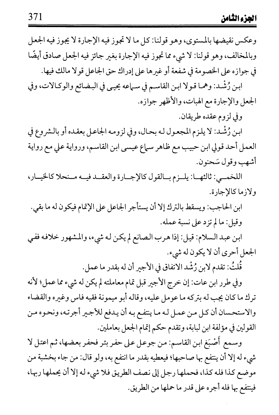 ابن رُشد: لأن الجعل لزم الجاعل باقتضاء البعض، ولو مات قبله، وبعد شخوصه فيه ثبت حقه خوف ذهاب عنائه باطلاً، ولوراثه اقتضاء ما أشرف على اقتضائه، وكذا في طلب الآبق، وحفر البئر له، ولوراثه إتمامه في موت الجاعل لا في حصاد زرع، ولقط زيتون اتفاقاً في الجميع.