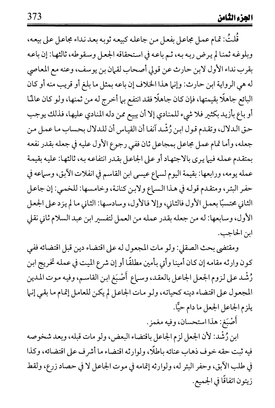 ولابن رُشْد: في سماع أصبغ: لو استأجر رجلاً على تبليغ عبد موضع كذا فمات في بعض الطريق أو أبق، ففي لزوم الإجارة، ويستعمله في مثل ما بقى، وانفساخها، وله من الأجر بقدر ما بلغ، ثالثها: الفرق بين الموت والإباق، ورابعها: تنفسخ في الإباق، ولا يكون له بقدر ما مضى، ولا تنفسخ في الموت لابن القاسم، وابن وَهْب من سماع أَصبغ ابن القاسم ولمالك، وللتخريج على قول مالك في تلف المستأجر على حمله من قبل ما عليه ابن الحاجب إن تنازعا في قدر الجعل تحالفا، ووجب جعل المثل.