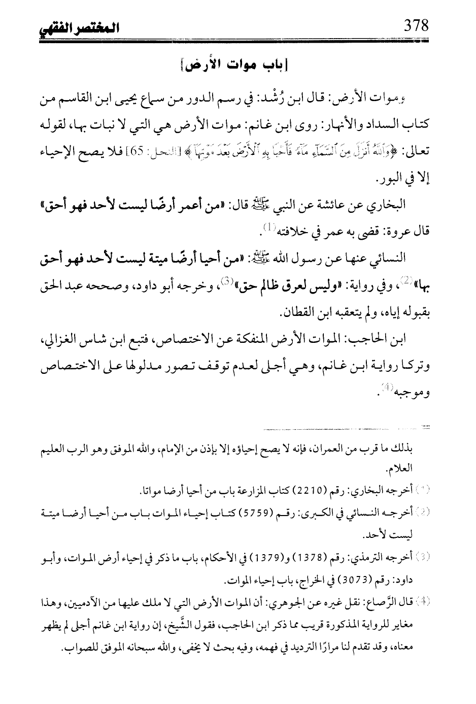 ابن رزقون: ولم أجد لابن رشد ما ذكراه عنه؛ بل قال: إثر سماع يحيى ابن القاسم: من استحق مواتاً بعمله فتركه حتى صار خراباً ليس يكون لمن أحب أن يعمره.