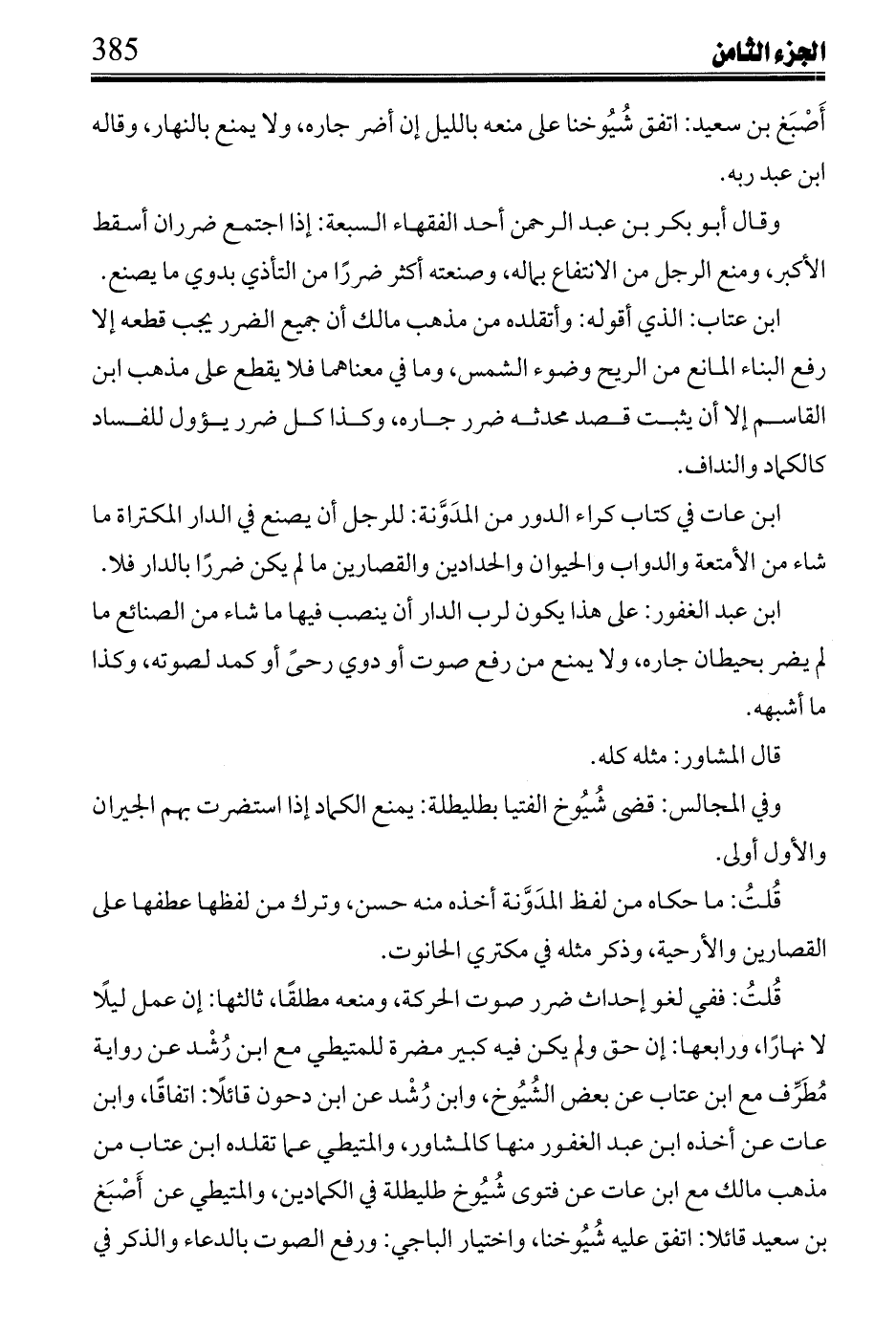 قلت: حديث سبع أذرع إنما ذكره عبد الحق عن مصنف عبد الرزاق، وقال في سنده جابر الجعفي، ولم يزد، وقال المزني في كتاب (رجال الكتب الستة): هو أكبر علماء الشيعة، وثقة شعبة وتركه جماعة وروى عنه شعبة والسفيانان، وفي كون إحداث حمام أو فرن قرب دار تجاوره لا يضرها بحال إلا أنه يحط من ثمنها ضررا يمنع أو لا نقلا المتيطي مع ابن سهل عن أبي المطرف مع بعض شيوخ ابن عتاب، وله مع بعض شيوخه.