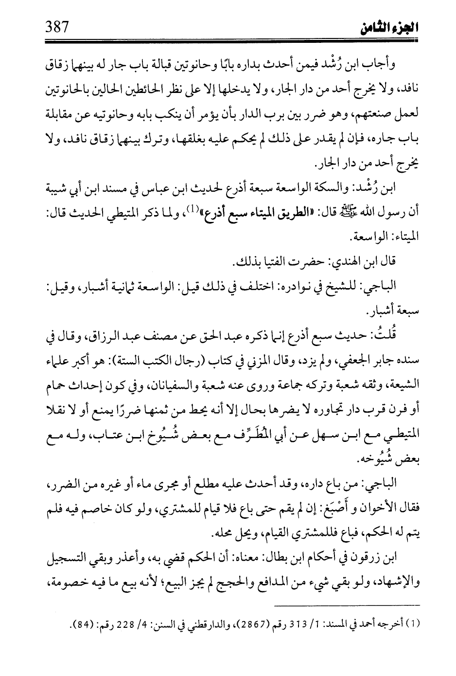 قلت: وزعم ابن زرقون أن يبيعه بعد علمه بالإحداث مع عدم قيامه به يسقط القيام اتفاقا، يرد بأنه إنما يصح هذا أن لو كان ضرر الإحداث يجاز بالعلم به مع السكوت عنه اتفاقا، وليس الأمر كذلك لما قاله ابن رشد هنا، وفي نوازل أصبغ حسبما تقدم، والعجب من قول ابن زرقون هذا مع كثرة اعتماده على كلام ابن رشد.