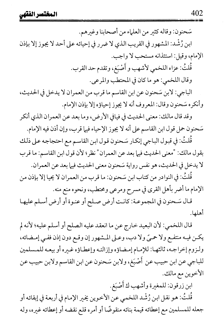 وقال بعد نقله قول ابن القُصَّار: قال ابن حبيب عن الأخوين: إن عمر فيما بعد فذلك له، وفيما قرب يخرج، ولو كان بإذن الإمام؛ لأنه فيء، وتبع ابن الحاجب ابن شاس.