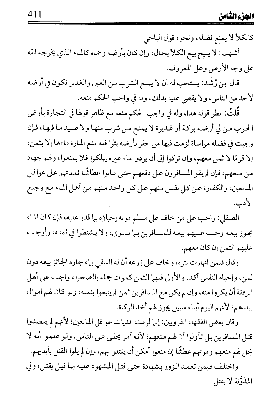 ابن رُشْد: قوله غرس بمائهم؛ يريد: بفضل مائهم، وقوله أرادوا حبس مائهم معناه: حبس فضل مائهم إذ لا خلاف في أن الرجل أحق بجميع مائه إن لم يكن فيه فضل عن حاجته، وما فضل عنه إن لم لكن لغيره إليه حاجة إلا ما يريده من ابتداء الانتفاع به منزرع يزرعه أو نخل يغرسها عليه فلربه منعه إلا بثمن بواجبه عليه وجد فيه ثمنًا عند غيره أو لم يجد، وإن كان لغير حاجة إليه لسقي نخل كان غرسها عليه