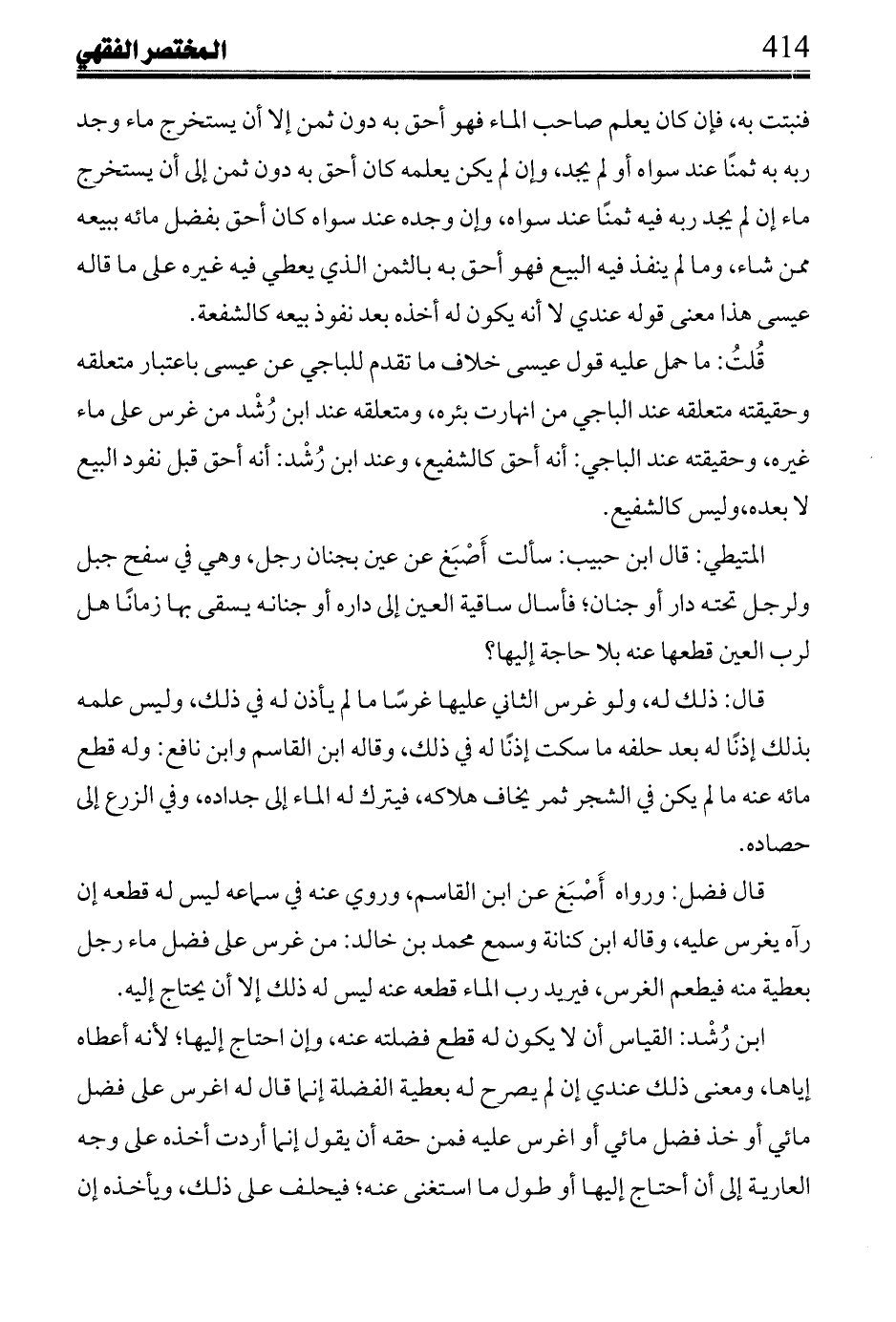 فقال غير واحد: واللفظ للمقدمات: حكم كل ماء غير متملك يجري على قوم إلى قوم أن من دخل أرضه أولًا أحق به حتى يبلغ في أرضه الكعبين، ثم في وجوب إرساله جميعه إلى الأسفل منه وقصر وجوب إرساله على ما زاد على الكعبين قولا ابن القاسم والأخوين مع ابن وَهْب.