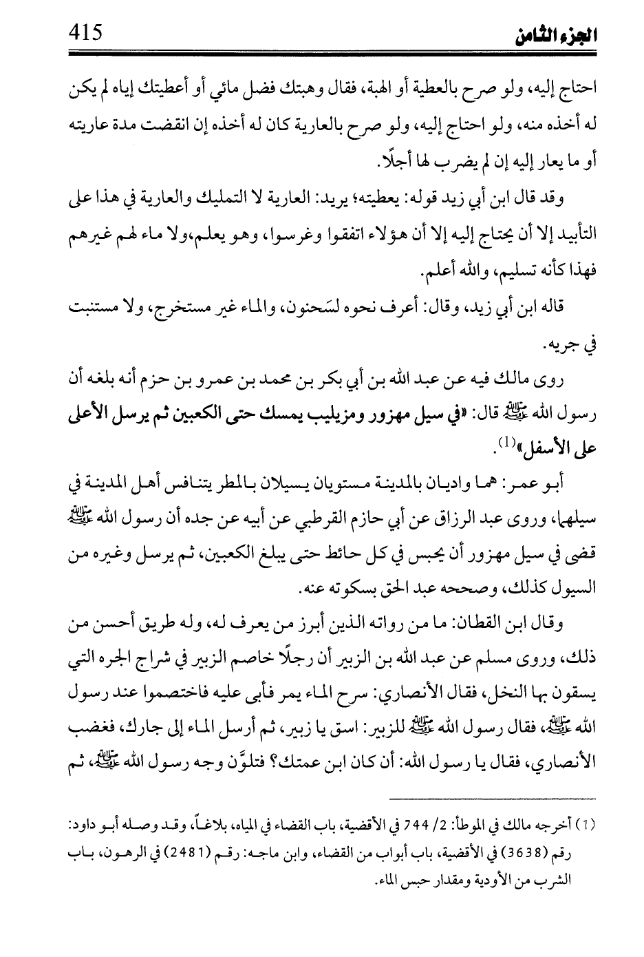 اللخمي: وفي المجموعة في قوم لهم سرج له واد إن أتت السيول يسقى مرجهم، وانصرف عنه ليس سد مصرفه عن مرج الآخرين إن انصرف عنهم قبل أن يدخل إلى أرضهم، وإن دخل إليهم كانوا أحق به، ولا يصرف عن قوم ما صرفه الله إليهم، ولا ينقلوه من مكان بعيد فيصرفوه إليهم دون من هو أقرب إليه منهم.