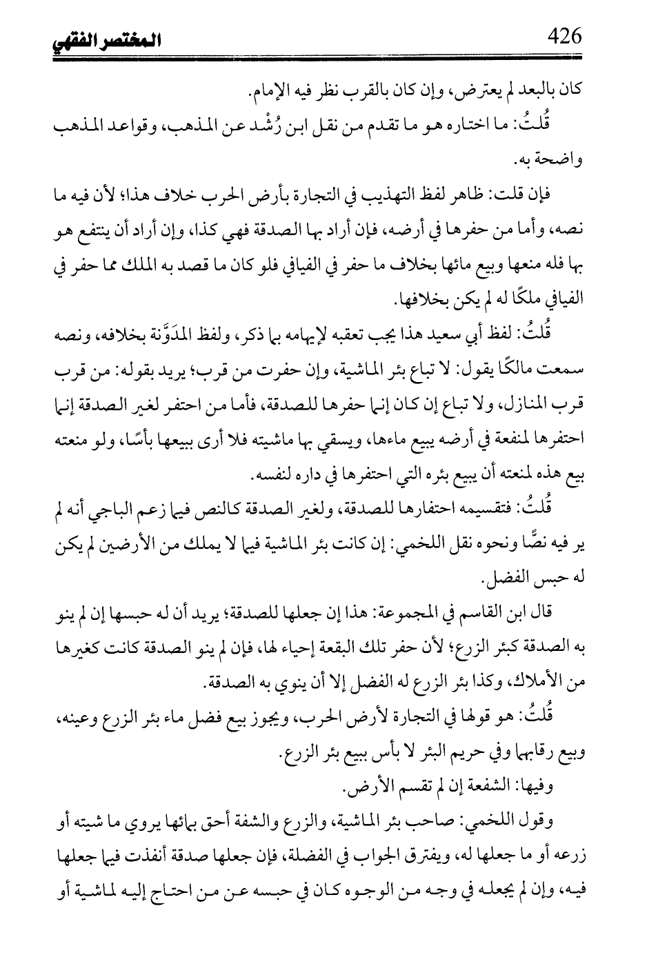 وأما العفاء والمسرح من أرض قريبة، فليس له بيع مائها من كلا، ولا منع أحد من فضل حاجته اتفاقاً إلا من يضره بدابة أو ماشية في زرع في شيء يكون له حواليه بالمرور عليه، وأما الأرض التي بورها للرعي، وترك زراعتها لذلك، ففي منع غيره إن احتاج إليه أو وجد من يشتريه والأجير على تركه للناس أو إن احتاج إليه أو وجد من يشتريه والأجير على تركه لللناس أو إن احتاج اليه فقط لا إن وجد من يشتريه قولا ابن القاسم مع ابن الماجِشُون وأشهب، وأما فحوض أرضه وفدادينه التي لم يبورها للرعي ففي شرط بيعه إياه بحاجته وجوازه مطلقاًً قولا أشهب مع ابن القاسم وابن الماجِشُون فأشهب يمنع فيه كلا مراعي ارضه بورها للكلا أو لم يبورها له وابن الماجِِشُون يحيزه فيهما، وابن القاسم يفرق في إجازه البيع له إذا استغنى عنه بين الأرض التي بورها للرعي وبين التي لم يبورها له ففي مجموع الطرفين ثلاثة أقوال، وقول مالك في حريم البئر منهاك لا بأس أيبيع الرجل كلا أرضه إن احتاج إليها، وإلا فليخل بينها وبين الناس مع قوله فيه: لا بأس أن يبيع الرجل خصب أرضه ممن يرعاه ذلك العام لا عامين قيل: هما اختلاف أجاز بيعه مرة وقف أرضه للرعي أو لا لابن الماجِشُون ومرة منعه فيهما كأشهب، وقيل: وفاق فرق بين وقفها وعدمه كابن القاسم، وهو تاويل عيسي بن دينار.