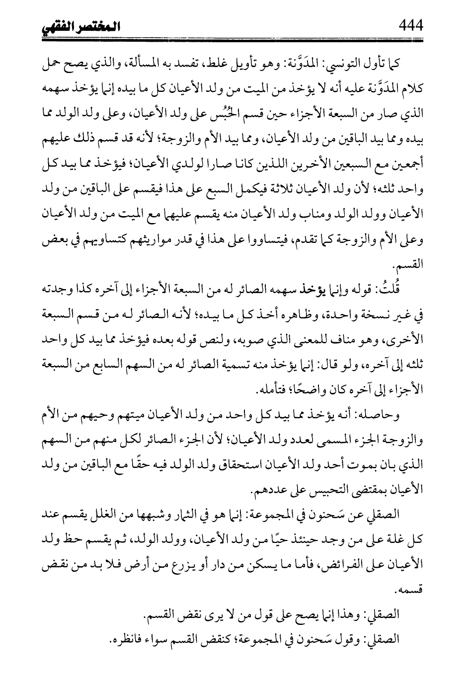 ابن رُشْد: يؤخذ من حظ الميت وسائر من بيده حظ غير الحفدة الجزء المسمى للخارج من تسوية الواحد من عدد البنين حيهم وميتهم يقسم كما مر، وعلى قول الأخوين يقسم كل حظ الميت مع الجزء المذكور ممن ذكر حيهم وميتهم غير ابن حي يقسم كذلك فلو مات أحد ولد الولد والبنون أحياء ففي نقض القسم فيقسم الحُبُس على خمسة كما مر، وبقائه ويقسم حظ الميت كذلك نقلاً الصقلي عن محمد مع غيره، وسماع عيسى ابن القاسم وعليه في دخول الأم والزوجة على ولد الأعيان فيما صار لهم نقلاه عنه مع سَحنون في المجموعة، وعنه في العتبيَّة قائلاً: لأن الوصية نفدت أولاً وارتفعت التهمة.