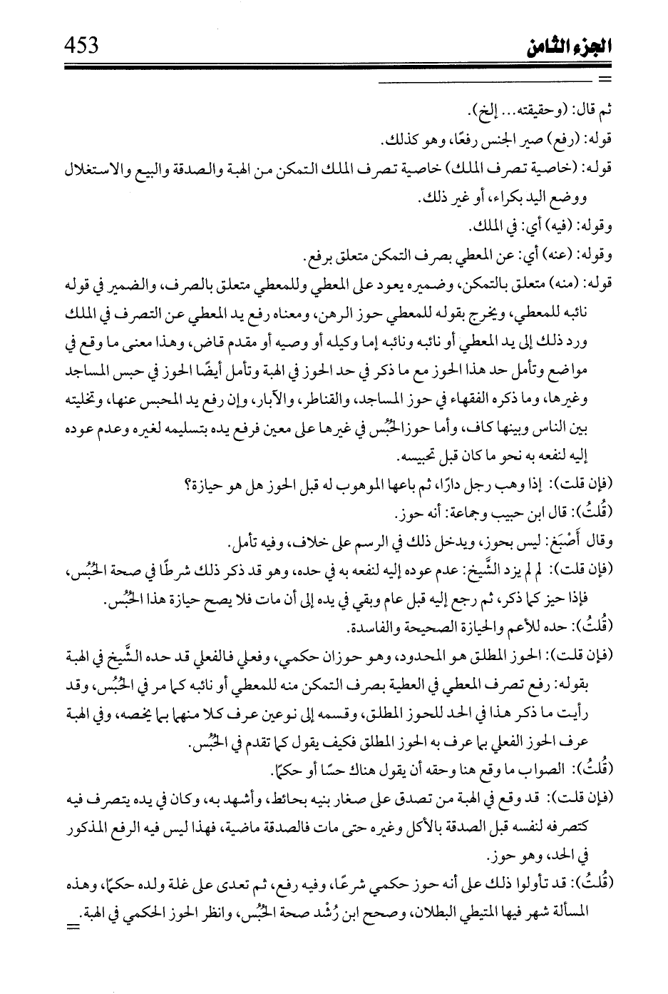 وله في كتاب الحبس: حوز المساجد والقناطير والمواجل والآبار رفع يد المحبس عنها وتخليته بين الناس وبينها، وحوز غيرها على معين يرفع يده بتسليمه لغيره، وعدم عوده إليه لنفعه به نحوه ما كان قبل تحبيسه.