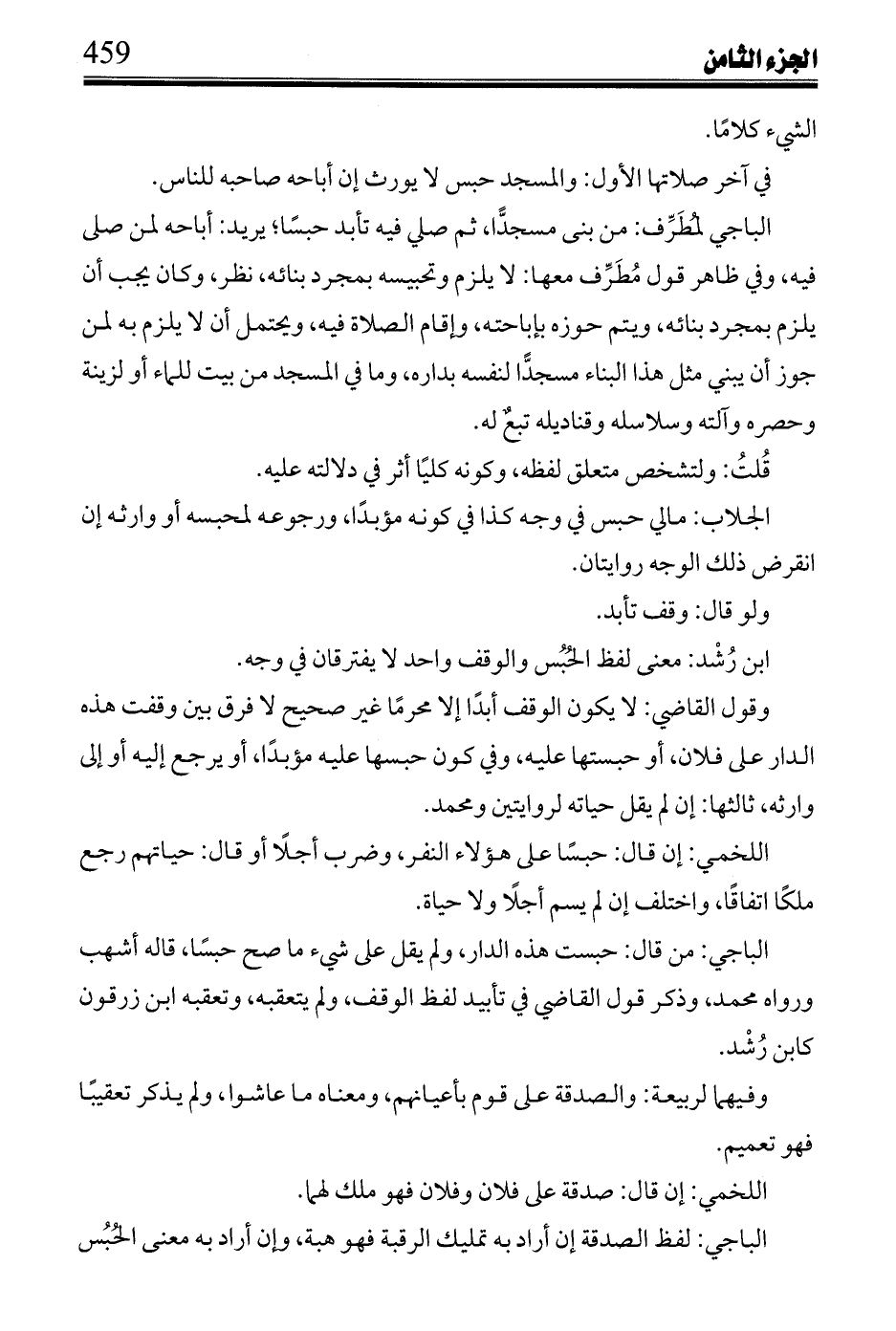قال: إن جعل لفظ الحُبُس في محصور غير معين يتوقع انقراضه، كقوله على بني زيد أو بنى عمرو وولده أو عقبه أو على من يطلب العلم بموضع كذا فهو حبس مؤبد هذا قوله فيها وفي غيرها، واختلف فيه قدماء أصحابه، ونقل اللخمي رواية الجلاب أنه