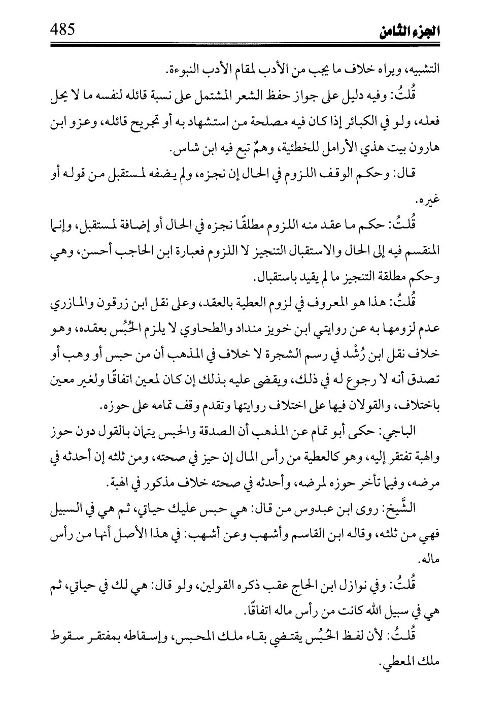 وأما الحبس فمن مات منهم بعد الطيب فحظه لوارثه، ومن مات قبل الآبار لا شيء لوراثة اتفاقًا فيهما، فإن مات أحدهم بعد الآبار قبل الطيب، وففي وجوب حظه لوراثة مطلقًا أو إن كان الميت أبر وسقى، ثالثها: لمن بقي منهم، ورابعها: هذا إن كانوا يلوا عملها أو كان المحبس عبدًا يخدمهم أو دار يسكنونها، وإن كان ثمرًا يقسم رجع