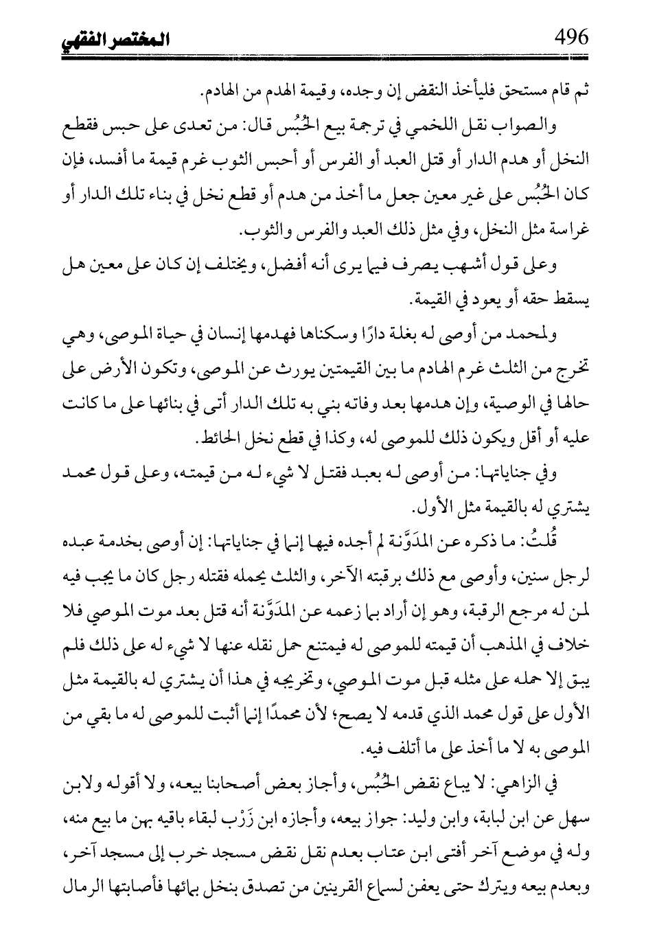 وفي «نوازل سَحنون»: لم يجز أصحابنا بيع الحُبُس بحال إلا دارًا جوار مسجد ليوسع بها، وليشتري بثمنها دار مثلها تكون حبسًا، وقد أدخل في مسجده - صلى الله عليه وسلم - دور كانت محبسه.