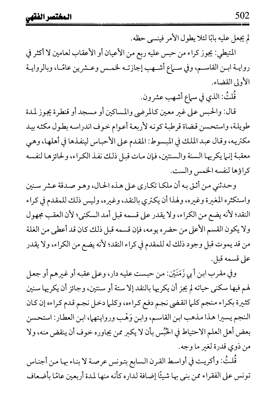 وكذا روى ابن القاسم في النوادر: لهم قلع نقضهم إلا أن يعطيهم قيمة ذلك مطروحاً في الأرض، ومعناه إن كان مضى من المدة ما يرى أنه بني لمثلها، وعلى رواية المدنيين أن للمكتري قيمة بنائه قائماً فالحكم في الحبس كما قاله في السماع طالت المدة أو قصرت، وهو ظاهر قول المخزومي فيها: أن البناء الذي له قدر مال من ماله هذا حكم ما بني للسكني إذا مات، وإن لم يمت فهو أحق بسكني ما بني لا يدخل عليه غيره فيه.