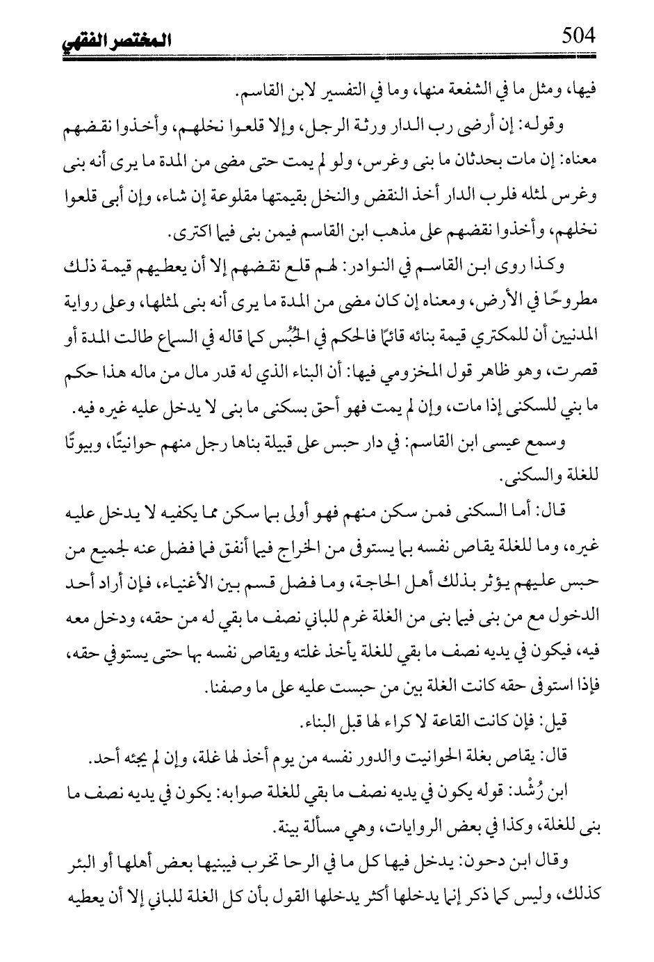 قال ابن القاسم في النوادر: وما على قوم بأعيانهم فقيرهم وغنيهم وحاضرهم وغائبهم سواء، وزاد في أول سماع عيسى بعد عزوه لمحمد: اتفاقاً، وقول ابن عبد السلام هذا ظاهر على القول بأنه عمري لا ترجع مراجع الأحباس.