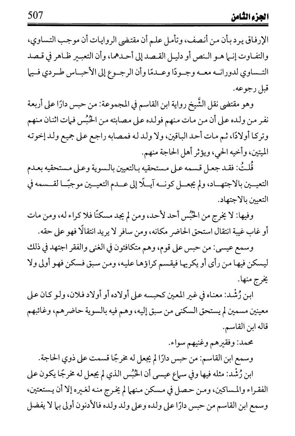 الشيخ: روي ابن عبدوس: من حبس على قوم وأعقابهم فهو كالصدقة يوصي أن تفرق على المساكين لمن وليها أن يفضل ذا الحاجة والمسكنة والمؤنة والعيال والزمانة وكذا غلة الحبس، ولا يعطي الغني شيئاً، ويعطي المسدود بقدر حالة، وإن كان للأغنياء أولاد كبار فقراء قد بلغوا أعطوا بقدر حاجتهم.