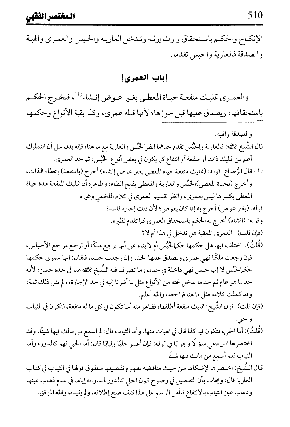 وإنما يريد مالك أنه لم يتلفظ فيها بلفظ العمري، ولا بما في معناها، وإنما قال: هي لك ولعقبك، ولم يحك المتيطي عن المذهب غير ما حكاه ابن فتوح، وابن الهندي خلاف ما ذكر ابن عات فاعرفه.