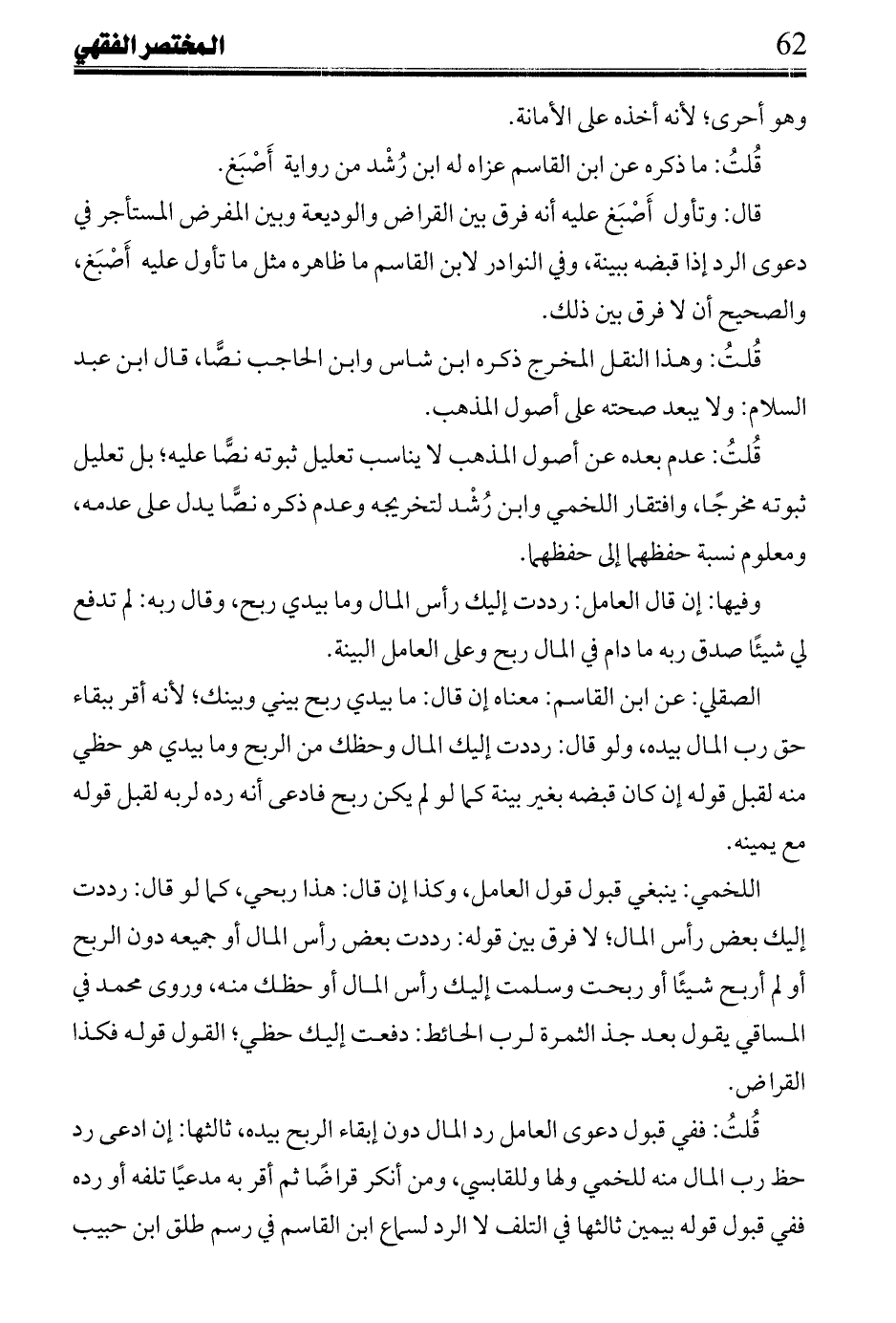 قلت: ففي قبوله دعوى العامل رد المال دون إبقاء الربح بيده، ثالثها: إن ادعى رد حظ رب المال منه للخمي ولها وللقابسي، ومن أنكر قراضا ثم أقر به مدعيا تلفه أو رده ففي قبوله قول بيمين ثالثها في التلف لا لرد السماع ابن القاسم في رسم طلق ابن حبيب