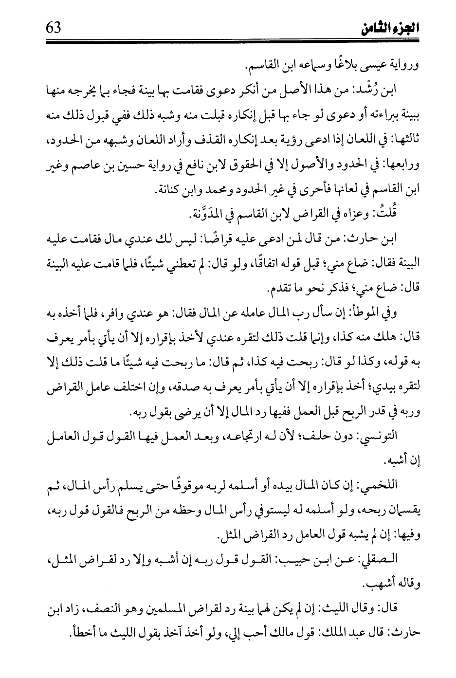 قال: وقال الليث: إن لم يكن لهما بينة رد لقراض المسلمين وهو النصف، زاد ابن حارث: قال عبدالملك: قول مالك أحب إلي، ولو أخذ بقول الليث ما أخطأ.