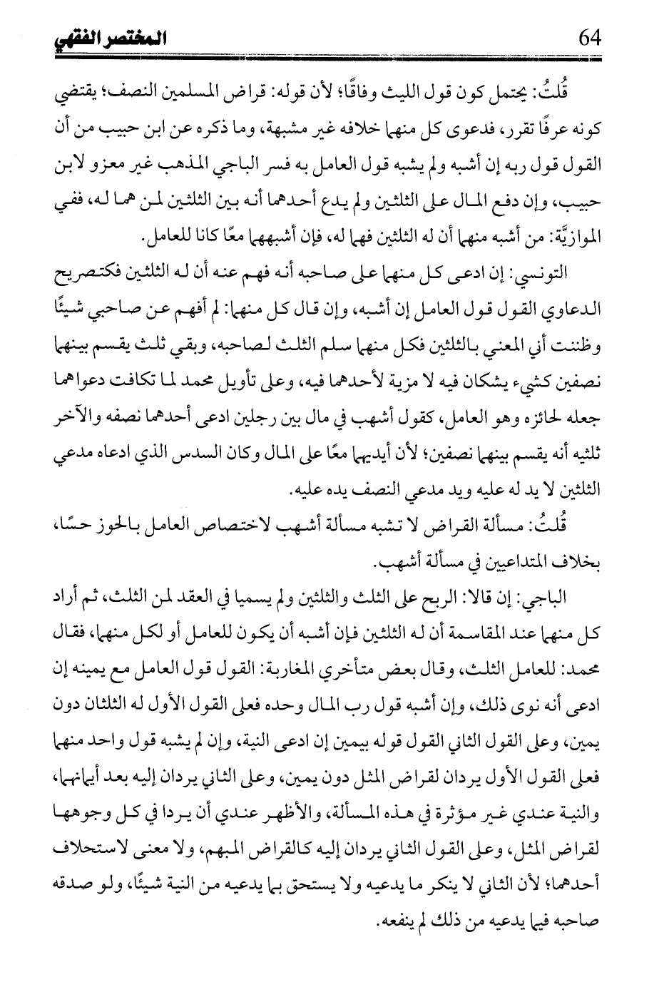 التونسي: إن ادعى كل منهما على صاحبه أنه فهم عنه أن له الثلثين فكتصريح الدعاوي القول قول العامل إن أِبه، وإن قال كل منهما: لم أفهم عن صاحبي شيئا وظننت أني المعني بالثلثين فكل منهما سلم الثلث لصاحبه، وبقى ثلث يقسم بينهما نصفين كشئ يشكان فيه لا مزية لأحدهما فيه، وعلى تأويل محمد لما تكافت دعواهما جعله لحائزه وهو العامل، كقول أِهب في مال بين رجلين أدعى أحدهما نصفه والآخر ثلثيه أنه يقسم بينهما نصفين، لأن أيديهما معًا على المال وكان السدس الذي ادعاه مدعي الثلثين لا يد له عليه ويد مدعي النصف يده عليه.