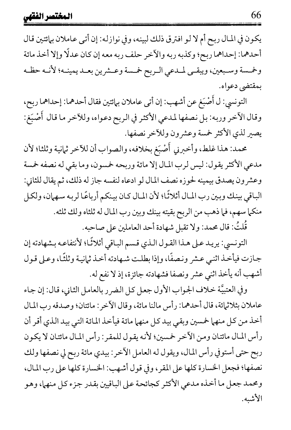 التونسي: ل أصبغ عنه أشهب: إن أتى عاملان بمائتين فقال أحدهما: إحداهما ربح، وقال الآخر وربه: بل نصفها لمدعي الأكثر في الربح دعواه، وللآخر ما قال أصبغ: يصير لذي الأكثر خمسة وعشرون وللآخر نصفها.