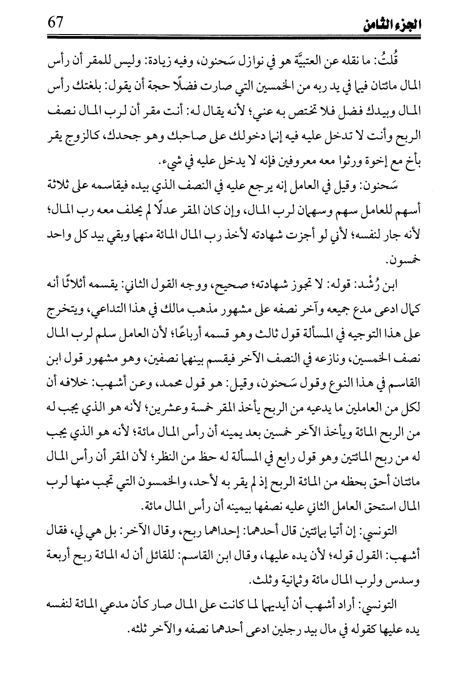 قلت: ما نقله عن العتبية هو في نوازل سحنون، وفيه زيادة: وليس للمقر أن رأس المال مائتان فيما في يد ربه من الخمسين التي صارت فضلا حجة أن يقول أن يقول: بلغنك رأس المال وبيدك فضل فلا تختص به عني، لأنه يقال له: أنت مقر أن لرب المال نصف الربح وأنت لا تدخل عليه فيه إنما دخولك على صاحبك وهو جحدك، كالزوج يقر بأخ مع إخوة رورثوا معه معروفين فإنه لا يدخل عليه في شئ.