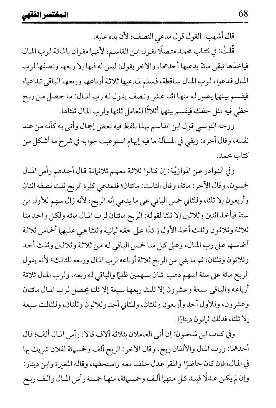 قلت: في كتاب محمد متصلاً بقول ابن القاسم، لأنهما مقران بالمائة لرب المال فيأخذها تبقي مائة يدعيها أحدهما، والآخر يقول: ليس له فيها إلا ربعها ونصفها لرب المال فدعواه لرب المال ساقطة، فسلم لمدعيها ثلاثة أرباعها وربعها الباقي تداعياه فيقسم بينهما يصير لها منها اثنا عشر ونصف يقول له رب المال: ما حصل من ربح حظي فيه مثل حظك فيقسم بينهما أثلاثاً للعامل ثلثها ولرب المال ثلثاها.
