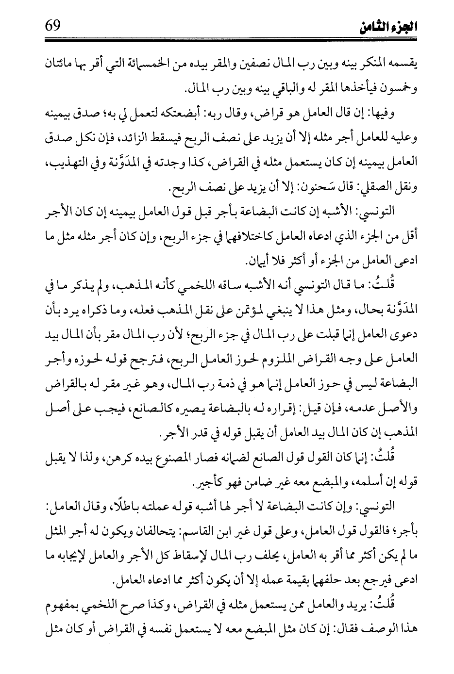 التونسي: الأشبه إن كانت البضاعة بأجر قبل قول العامل بيمينه إن كان الأجر أقل من الجزء الذي ادعاه العامل كاختلافهما في جزء الربح، وإن كان أجر مثله مثل ما ادعى العامل من الجزء أو أكثر فلا أيمان.