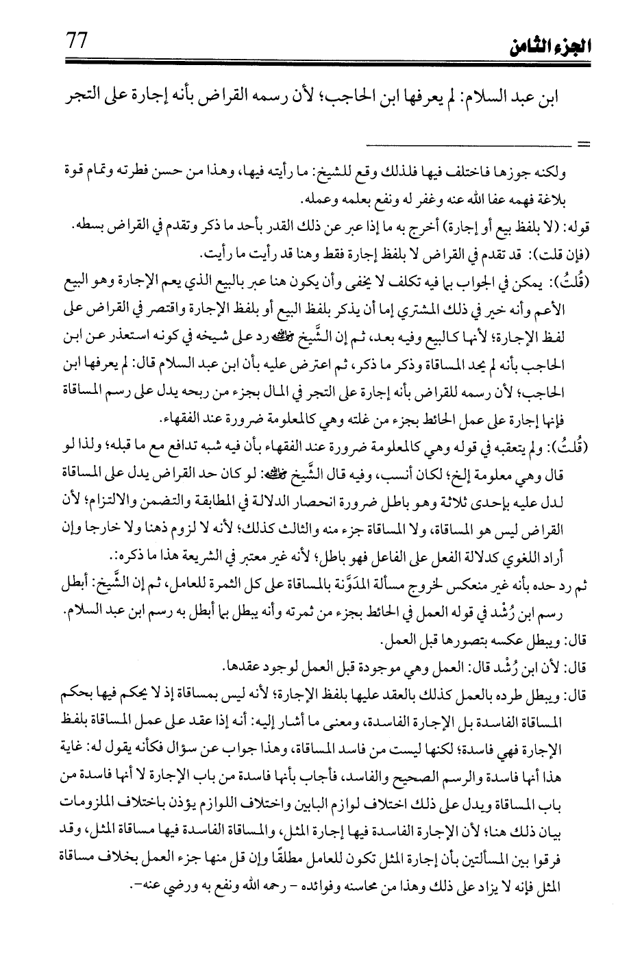 ابن عبد السلام: لم يعرفها ابن الحاجب، لأن رسمه القراض بأنه إجارة على التجر