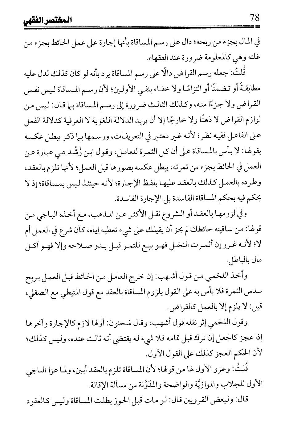 قُلتُ: وعزو الأول لها من قولها؛ أن المساقاة تلزم بالعقد أبين، ولما عزا الباجي الأول للجلاب والموازية والواضحة والمدونة من مسألة الإقالة.