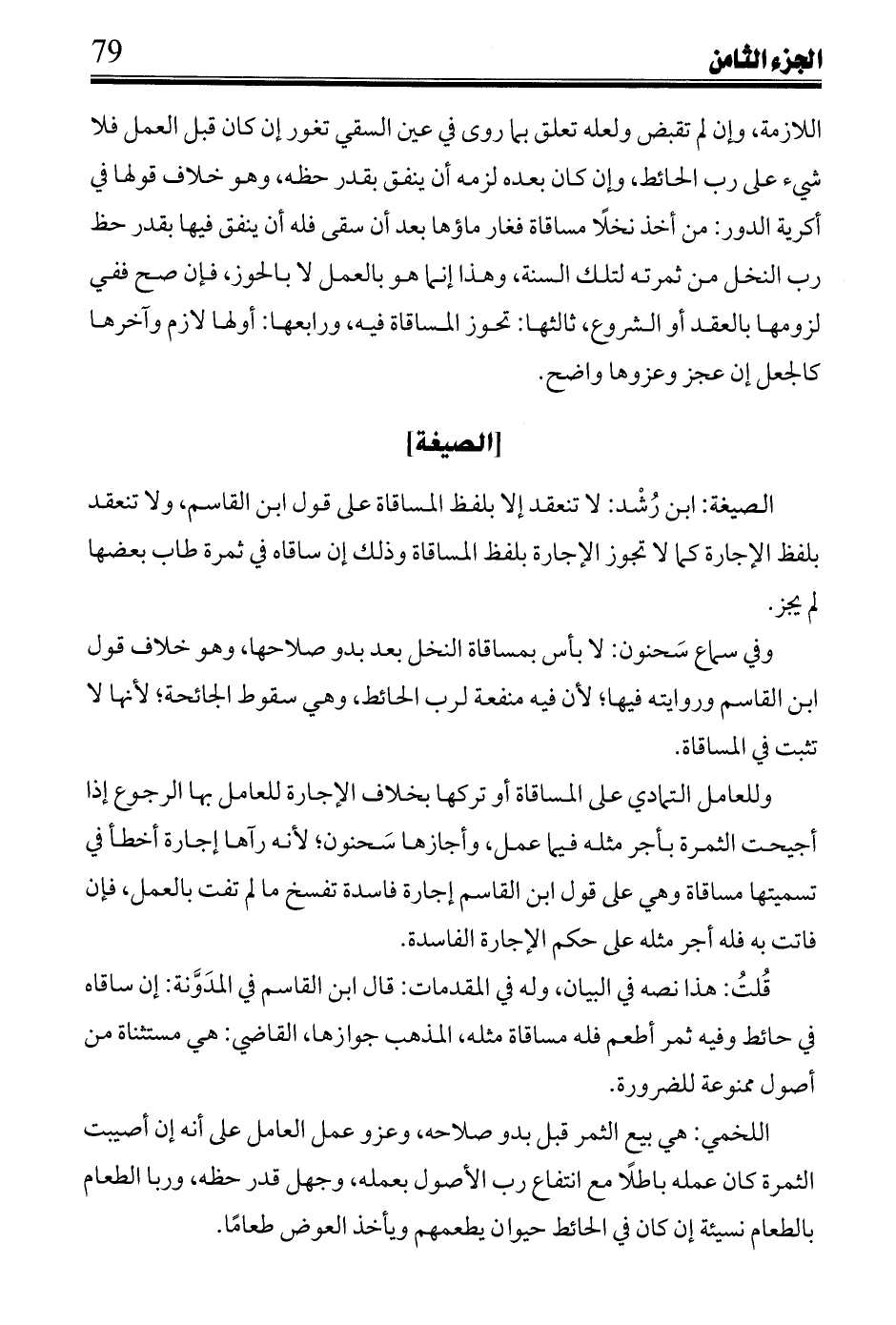 الصيغة: ابن رشد: لا تنعقد إلا بلفظ المساقاة على قول ابن القاسم، ولا تنعقد بلفظ الاجارة كما لا تجوز الإجارة بلفظ المساقات وذلك إن ساقاه في ثمره طاب بعضها لم يحجز.