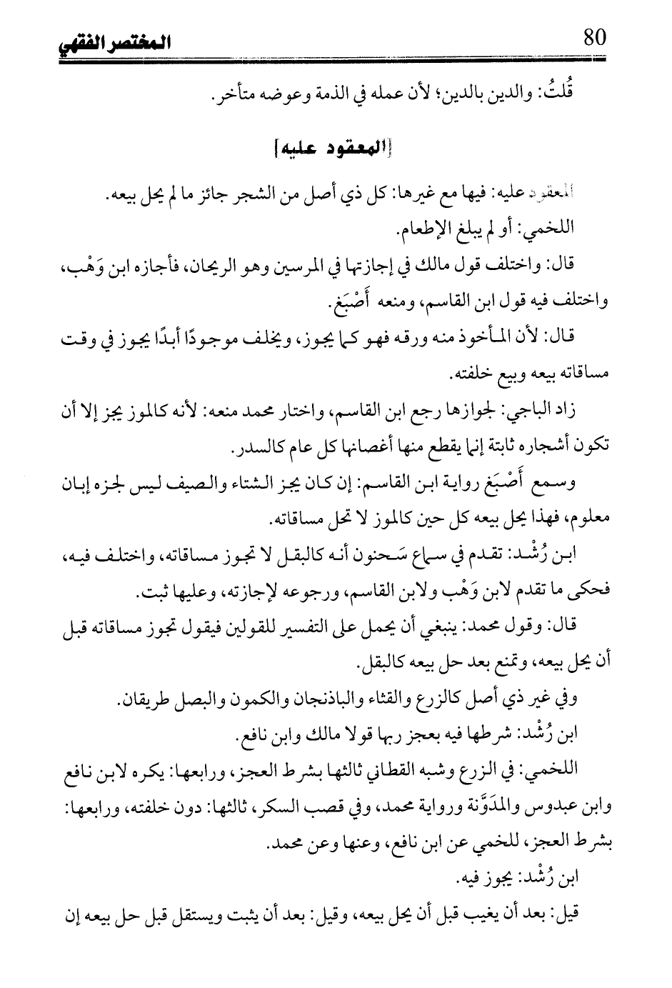 اللخمي: في الزرع وشبه القطاني ثالثها بشرط العجز، ورابعها: يكره لابن نافع وابن عبدوس والمدونة ورواية محمد، وفي قصب السكر، ثالثهما: دون خلفته، ورابعها: بشرط العجز، للخمي عن ابن نافع، وعنها وعن محمد.