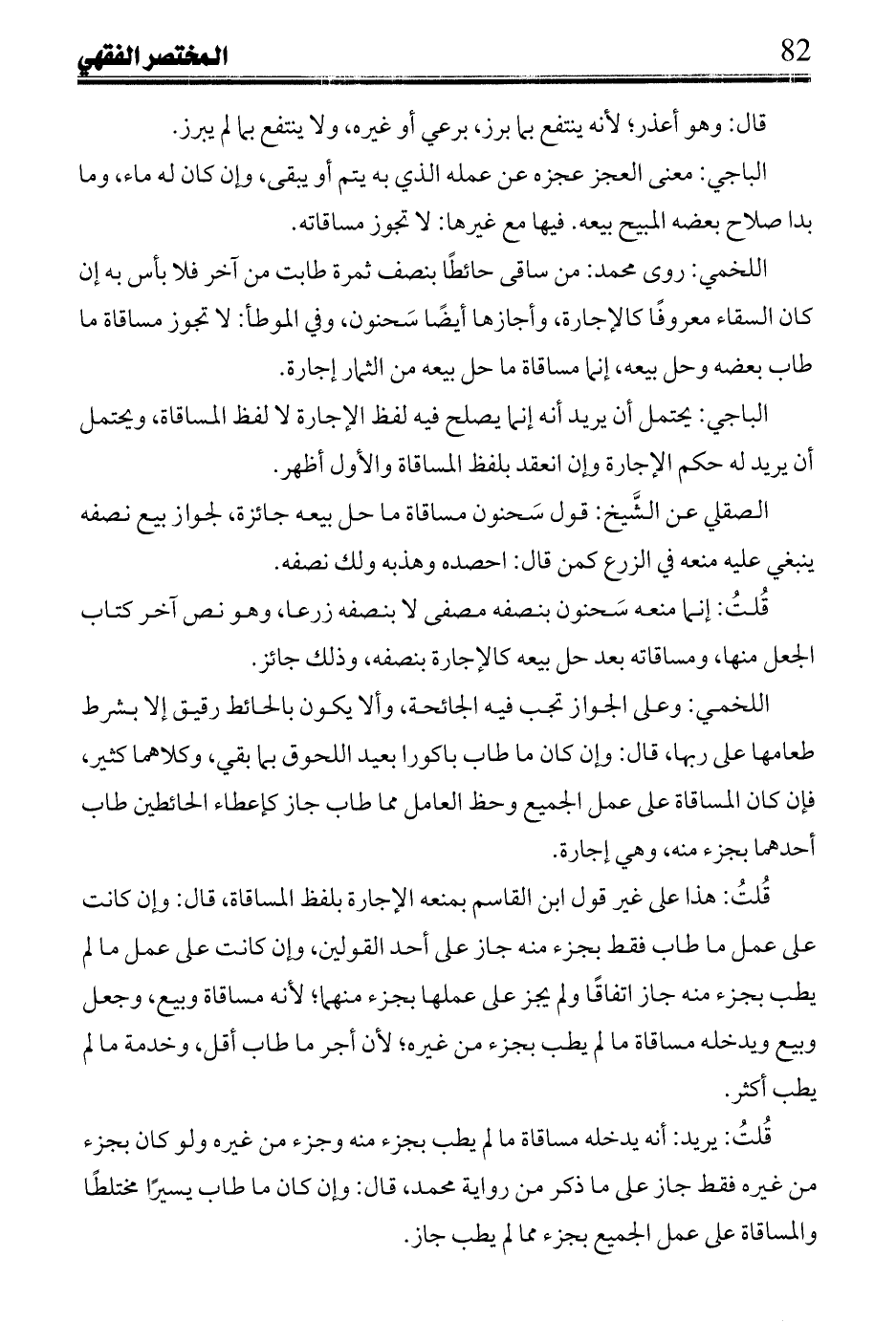 قُلتُ: هذا على غير قول ابن القاسم بمنعه الإجارة بلفظ المساقاة قال: وإن كانت على عمل ما طاب فقط بجزء منه جاز على أحد القولين، وإن كانت على عمل مالم يطب بجزء منه جاز اتفاقاً ولم يجز على عملها بجزء منهما، لأن مساقاة وبيع، وجعل وبيع ويدخله مساقاة مالم يطب من غيره، أن أجر ما طاب أقل، وخدمة مالم يطب أكثر.