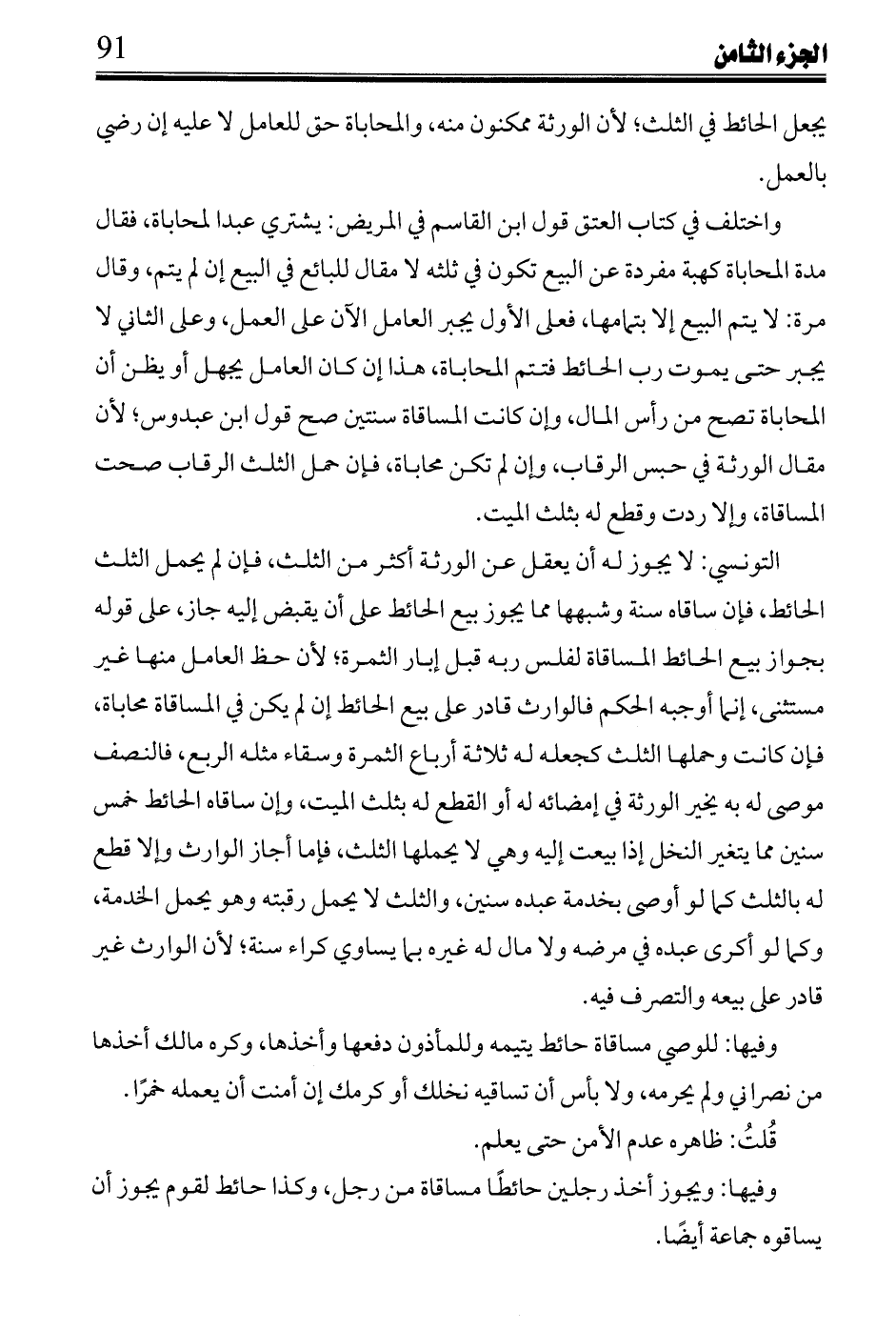 التونسي: لا يجوز له أن يعقل عن الورثة أكثر من الثلث، فإن لم يحمل الثلث الحائط، فإن ساقاه سنة وشبهها مما يجوز بيع الحائط على أن يقبض إليه جاز، على قوله بجواز بيع الحائط المساقاة لفلس ربه قبل إبار الثمرة؛ لأن حظ العامل منها غير مستثنى، إنما أوجبه الحكم فالوارث قادر على بيع الحائط إن لم يكن في المساقاة محاباة، فإن كانت وحملها الثلث كجعله له ثلاثة أرباع الثمرة وسقاء مثله الربع، فالنصف موصى له به يخير الورثة في إمضائه له أو القطع له بثلث الميت، وإن ساقاه الحائط خمس سنين مما يتغير النخل إذا بيعت إليه وهي لا يحملها الثلث، فإن أجاز الوارث وإلا قطع له بالثلث كما لو أوصى بخدمة عبده سنين، والثلث لا يحمل رقبته وهو يحمل الخدمة، وكما لو أكرى عبده في مرضه ولا مال له غيره بما يساوي كراء سنة؛ لأن الوارث غير قادر على بيعه والتصرف فيه.