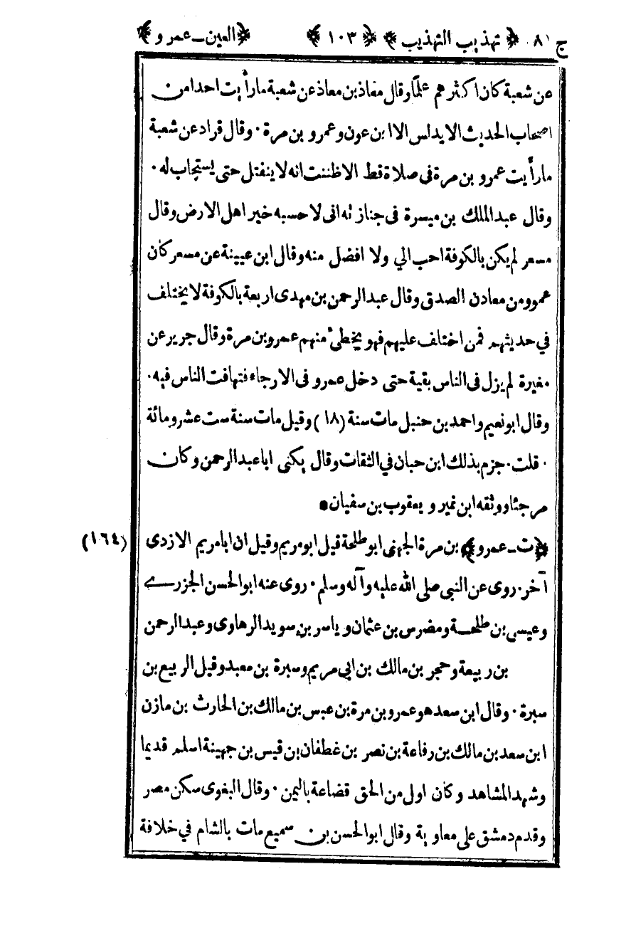 عن شعبة كان أكثرهم علما وقال معاذ بن معاذ عن شعبة ما رأيت أحدا من أصحاب الحديث الا يدلس الا بن عون وعمرو بن مرة وقال قراد عن شعبة ما رأيت عمرو بن مرة في صلاة قط الا طننت أنه لا ينفتل حتى يستجاب له وقال عبد الملك بن ميسرة في جنازته إني لأحسبه خير أهل الأرض وقال مسعر لم يكن بالكوفة أحب إلى ولا أفضل منه وقال بن عيينة عن مسعر كان عمرو من معادن الصدق وقال عبد الرحمن بن مهدي أربعة بالكوفة لا يختلف في حديثهم فمن اختلف عليهم فهو يخطىء منهم عمرو بن مرة وقال جرير عن مغيرة لم يزل في الناس بقية حتى دخل عمرو في الإرجاء فتهافت الناس فيه وقال أبو نعيم وأحمد بن حنبل مات سنة 18 وقيل مات سنة ست عشر ومائة قلت جزم بذلك بن حبان في الثقات وقال يكنى أبا عبد الرحمن وكان مرجئا ووثقه بن نمير ويعقوب بن سفيان