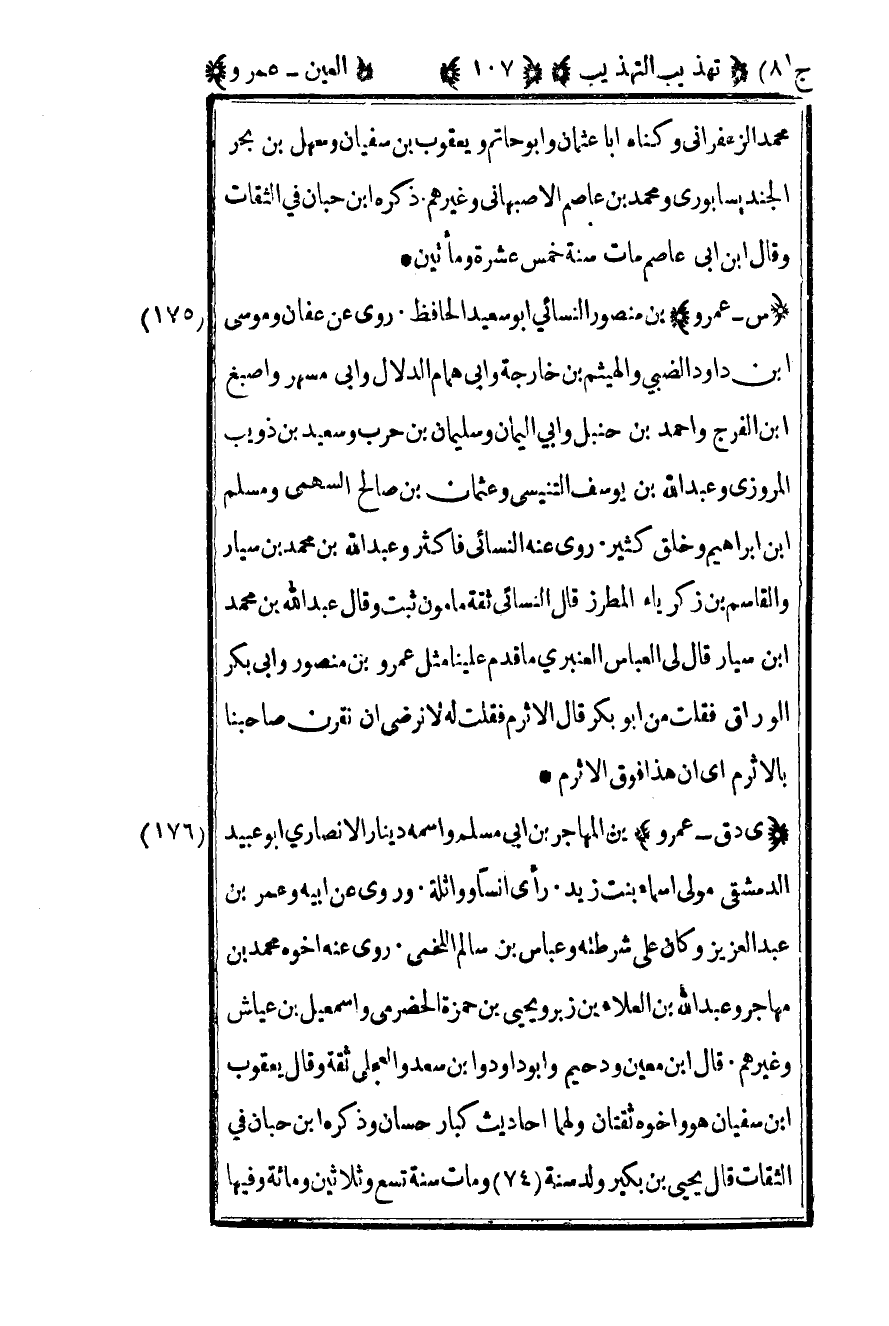 176- "س – عمرو" بن منصور النسائي أبو سعيد الحافظ روى عن عفان وموسى بن داود الضبي والهيثم بن خارجة وأبي همام الدلال وأبي مسهر وأصبغ بن الفرج وأحمد بن حنبل وأبي اليمان وسليمان بن حرب وسعيد بن ذويب المروزي وعبد الله بن يوسف التنيسي وعثمان بن صالح السهمي ومسلم بن إبراهيم وخلق كثير روى عنه النسائي فأكثر وعبد الله بن محمد بن سيار والقاسم بن زكريا المطرز قال النسائي ثقة مأمون ثبت وقال عبد الله بن محمد بن سيار قال لي العباس العنبري ما قدم علينا مثل عمرو بن منصور وأبي بكر الوراق فقلت من أبو بكر قال الأثرم فقلت له لا نرضى أن نقرن صاحبنا بالاثرم أي أن هذا فوق الأثرم